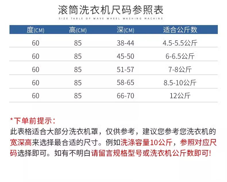 | Tamaño | Adecuado para 4.5 ~ 5.5 kg lavadora,Adecuado para 6 ~ Lavadora 6,5 kg,Adecuado para 7 ~ 8 kg de lavadora,Adecuado para 8.5 ~ Lavadora de 10 kg,Apto para lavadora de 12 kg |