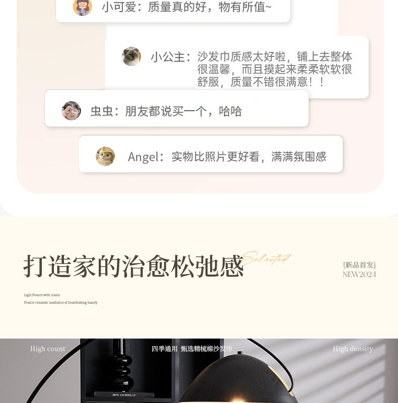 | Tamaño | 90x90cm [se puede hacer mantas de rodillas], 90x150cm [se puede hacer mantas de siesta], 90x180cm [se puede utilizar para gabinetes de televisión], 90x210cm [se puede utilizar para cojines / mantas de cola de cama], 90x240cm [se puede utilizar para cojines / mantas de cola de cama], 130x180cm [se puede utilizar para asientos individuales], 180x180cm [sofá individual], 180x230cm [sofá doble], 180x260cm [sofá doble cubierta completa], 180x300cm [sofá pequeño para tres personas], 180x340cm [Sofá de tres personas cubierta completa] 180x380cm [Sofá de tres personas cubierta completa] |