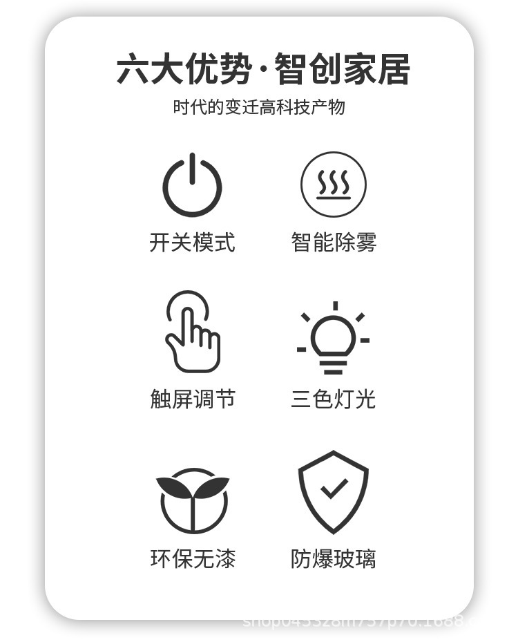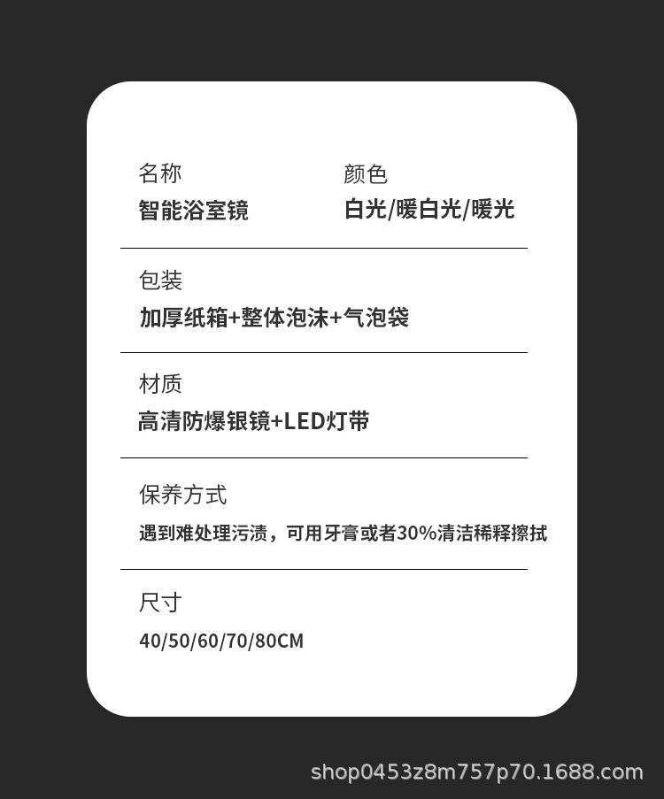 | Color | El espejo cuadrado de retroiluminación es inteligente - iluminación (luz monocromática), el espejo cuadrado de retroiluminación es inteligente - iluminación + eliminación de niebla (luz monocromática), el espejo cuadrado de retroiluminación es inteligente - iluminación + eliminación de niebla + visualización de tiempo (luz monocromática), el espejo cuadrado de retroiluminación es inteligente - iluminación + eliminación de niebla (luz tricolor), el espejo cuadrado de retroiluminación es inteligente - iluminación + eliminación de niebla + visualización de tiempo (luz tricolor) |