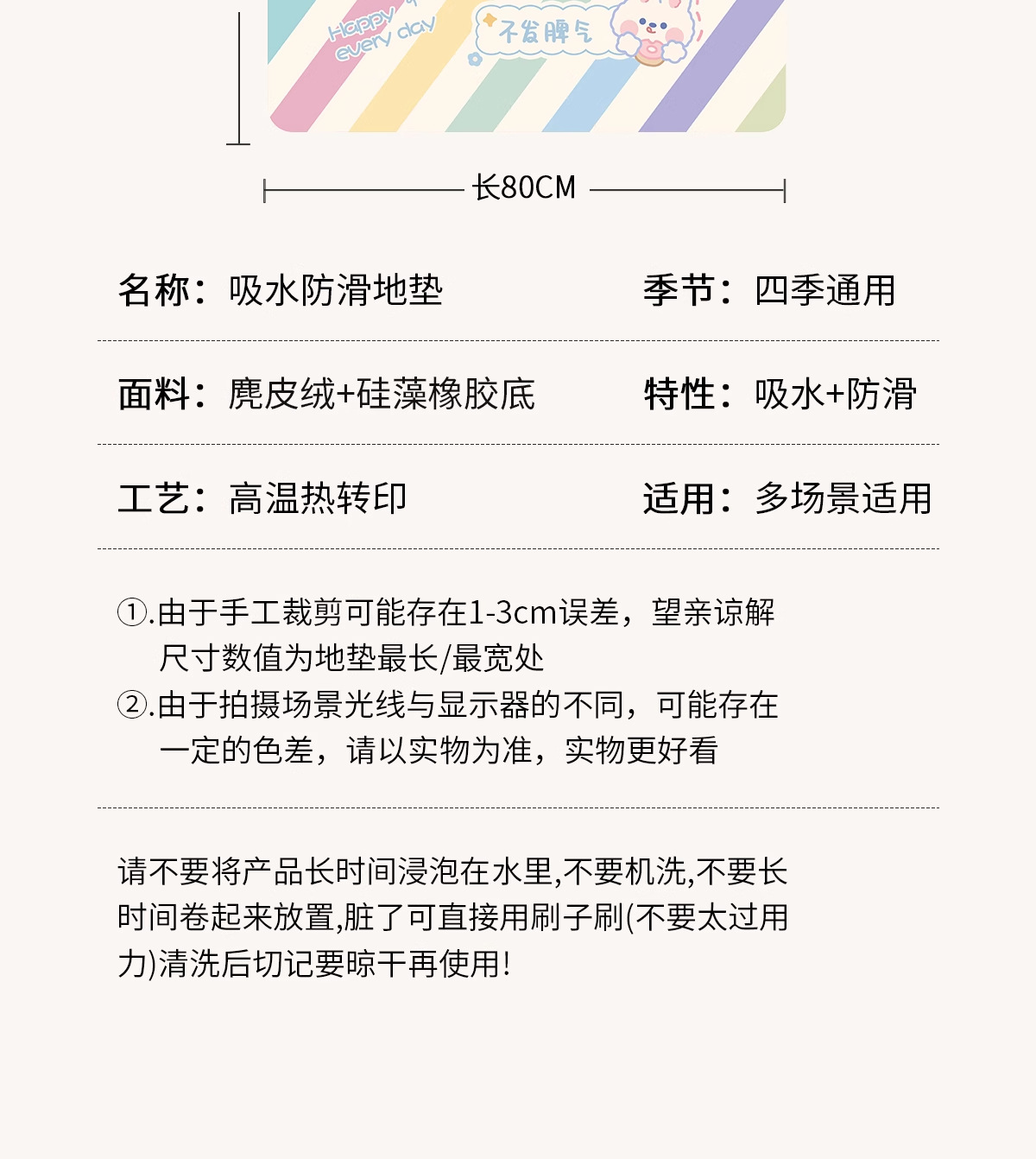 | Tamaño | 40*60cm [aumento de espesor 4mm],45*70cm [mesa de lavado de manos/puerta de baño/universal],50*80cm [material ecológico, seguro y sin olor],60*90cm [doble cara antideslizante firmemente pegado al suelo],80*120cm [Fácil de limpiar, resistente al desgaste y a la suciedad],Personalizado 50/㎡ Póngase en contacto con el servicio al cliente para cambiar el precio [no admite devolución] |
