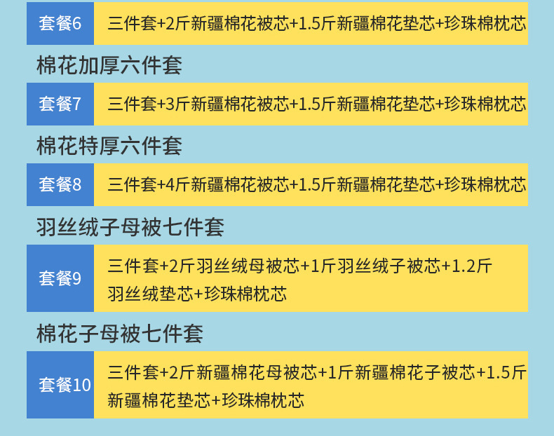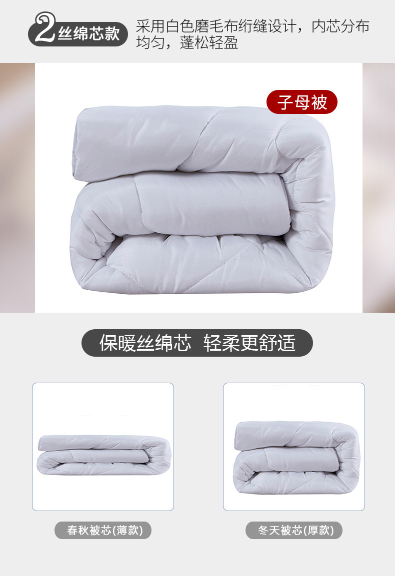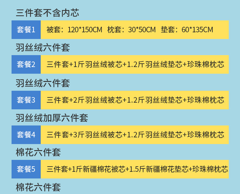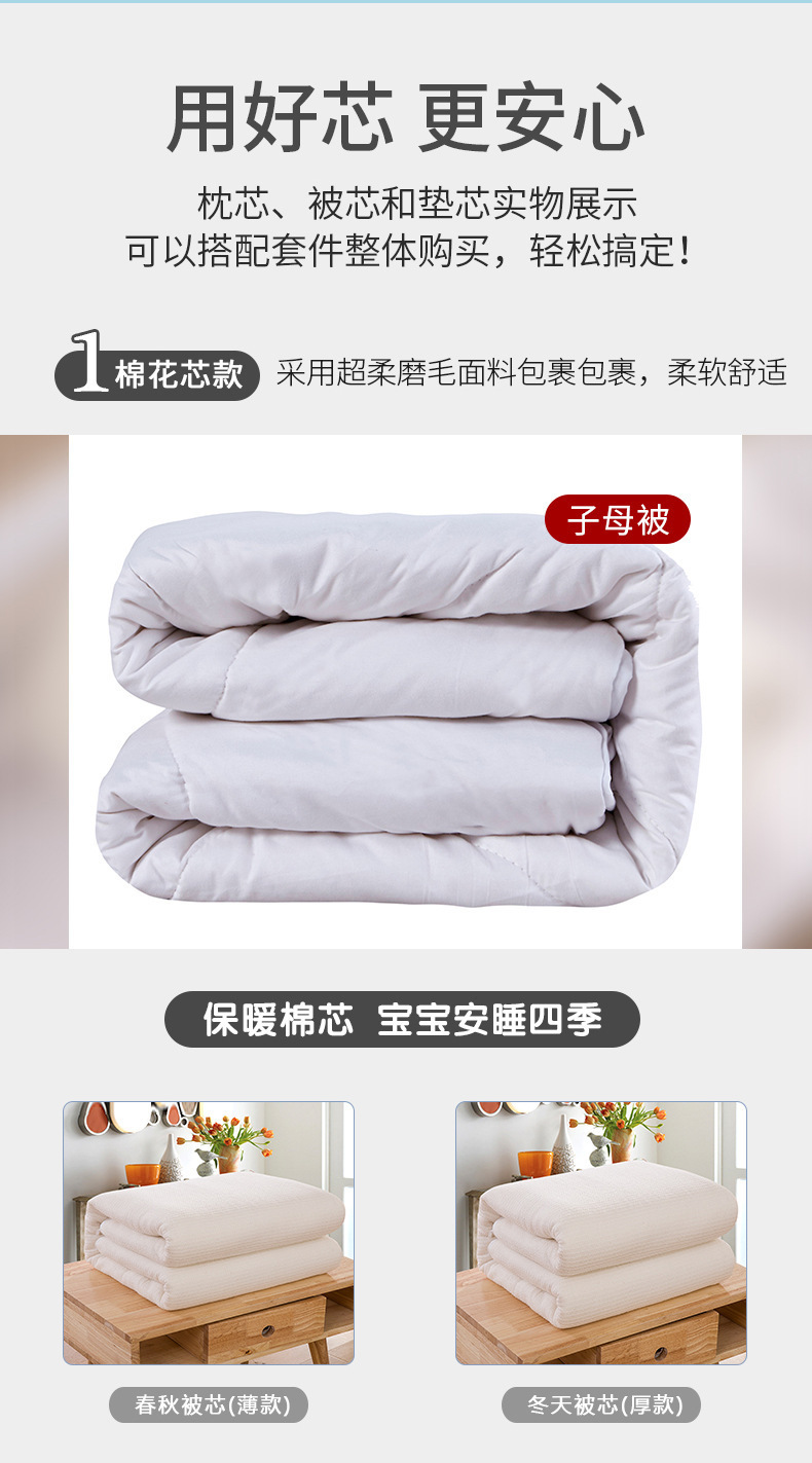 | Especificaciones de tamaño | 120x150cm cubierta de una sola pieza, cubierta de algodón de tres piezas (cubierta de edredón 120x150cm, cubierta de cojín 60x135, funda de almohada 30x50), 1 kg de conjunto de seis piezas [conjunto de tres piezas + núcleo de edredón 1 kg + núcleo de edredón de seda 1.5 kg + núcleo de almohada de seda] 2 kg de conjunto de seis piezas [conjunto de tres piezas + núcleo de edredón de seda 2 kg + núcleo de edredón de seda 1.5 kg + núcleo de almohada de seda] 3 kg de conjunto de seis piezas [conjunto de tres piezas + núcleo de edredón de seda 3 kg + núcleo de edredón de seda 1.5 kg + núcleo de almohada de seda], 1 jin 6 piezas [conjunto de tres piezas + núcleo de edredón de algodón 1 jin + núcleo de almohadilla de algodón 1,5 jin + núcleo de almohada de terciopelo], 2 jin 6 piezas [conjunto de tres piezas + núcleo de edredón de algodón 2 jin + núcleo de almohada de algodón 1,5 jin + núcleo de almohada de seda], 3 jin 6 piezas [conjunto de tres piezas + núcleo de edredón de algodón 3 jin + núcleo de almohada de algodón 1,5 jin + núcleo de almohada de terciopelo], 4 jin 6 piezas [conjunto de tres piezas + núcleo de edredón 4 jin + núcleo de almohada de algodón 1,5 jin + núcleo de almohada de terciopelo], 1 kg 6 conjuntos de piezas [conjunto de tres piezas + núcleo de colcha de soja 1 kg + núcleo de colcha de soja 1.5 kg + núcleo de almohada de pluma] 2 kg 6 conjuntos de piezas [conjunto de tres piezas + núcleo de colcha de soja 2 kg + núcleo de colcha de soja 1.5 kg + núcleo de almohada de pluma de seda] 3 kg 6 conjuntos de piezas [conjunto de tres piezas + núcleo de colcha de soja 3 kg + núcleo de colcha de soja 1.5 kg + núcleo de almohada de pluma de seda], núcleo de colcha de seda 7 conjuntos de piezas [conjunto de tres piezas + núcleo de colcha 1 kg + núcleo de colcha 2 kg + núcleo de colcha de seda 1.2 kg + núcleo de almohada de seda], 7 conjuntos de núcleo de edredón de algodón [conjunto de tres piezas + núcleo de edredón 1 kg + núcleo de edredón 2 kg + núcleo de almohada 1.5 kg + núcleo de almohada], 7 conjuntos de núcleo de edredón de soja [conjunto de tres piezas + núcleo de edredón 1 kg + núcleo de edredón 2 kg + núcleo de almohada 1.5 kg + núcleo de almohada] |