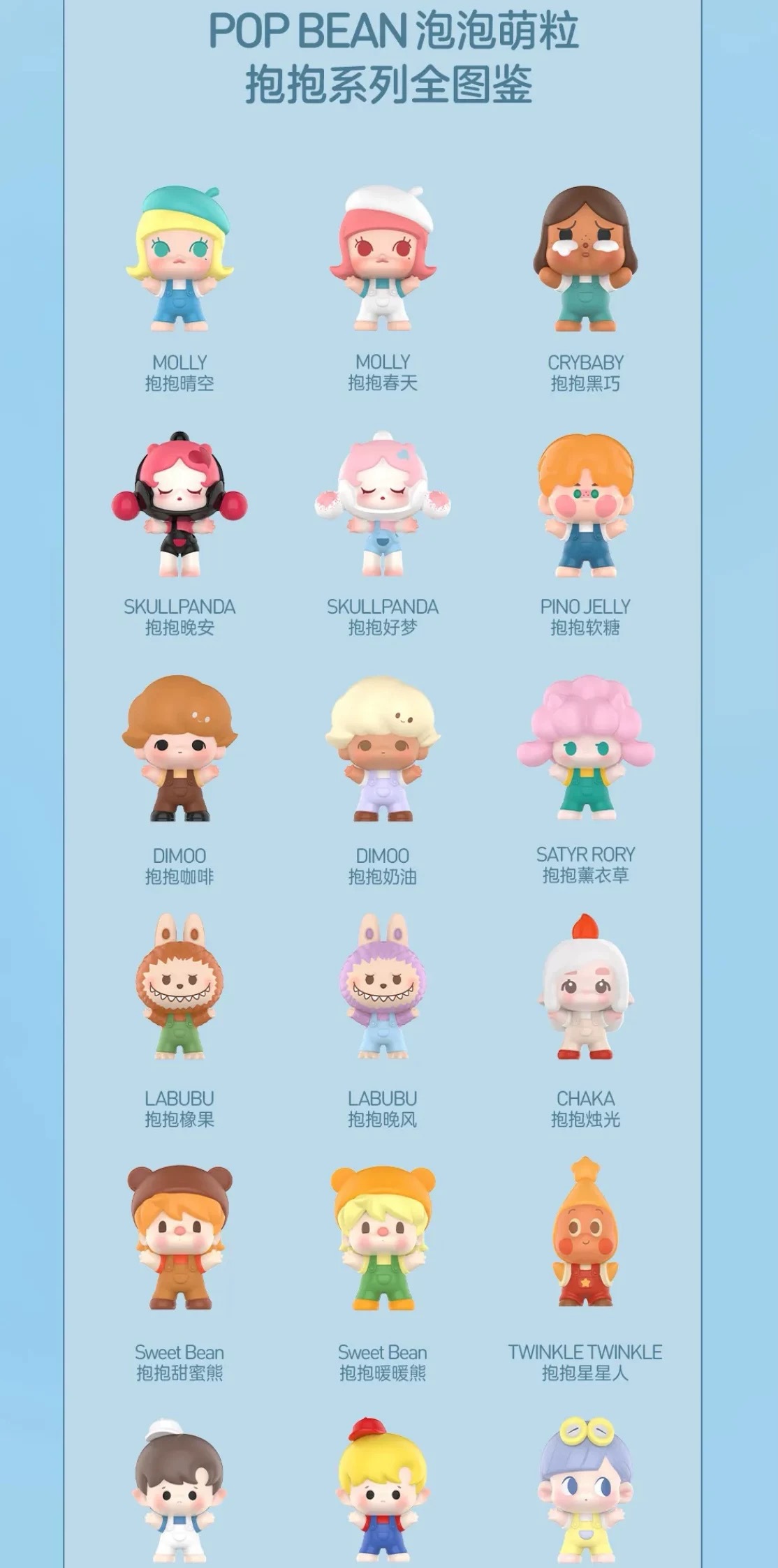 | Colores | Molly abraza el cielo despejado,Molly abraza la primavera,Bebé llorando abrazando a Hei Qiao,SP abraza un buen sueño,SP abraza buenas noches,Café Dimoo,Crema de abrazo de Dimoo,Brabu abraza bellota,Rab Bu abraza la brisa de la tarde,Frijoles dulces abraza al oso dulce,Pequeños frijoles dulces abrazan al oso cálido,Abrazando estrellas,Ja está lleno de infancia,Ha tiempo lleno,Unicornio abraza el arco iris,Bi Qi abraza el sol,LiLiOS abraza pequeñas gotas de lluvia,Pan Shen abraza lavanda,PINO abrazo fondant,CHAKA abraza la luz de las velas,El conjunto completo de 20 series de abrazos no se repite |