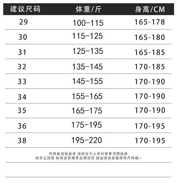 | Talla | 29【100-115】,30【115-125】,31【125-135】,32【135-145】,33【145-155】,34【155-165】 |