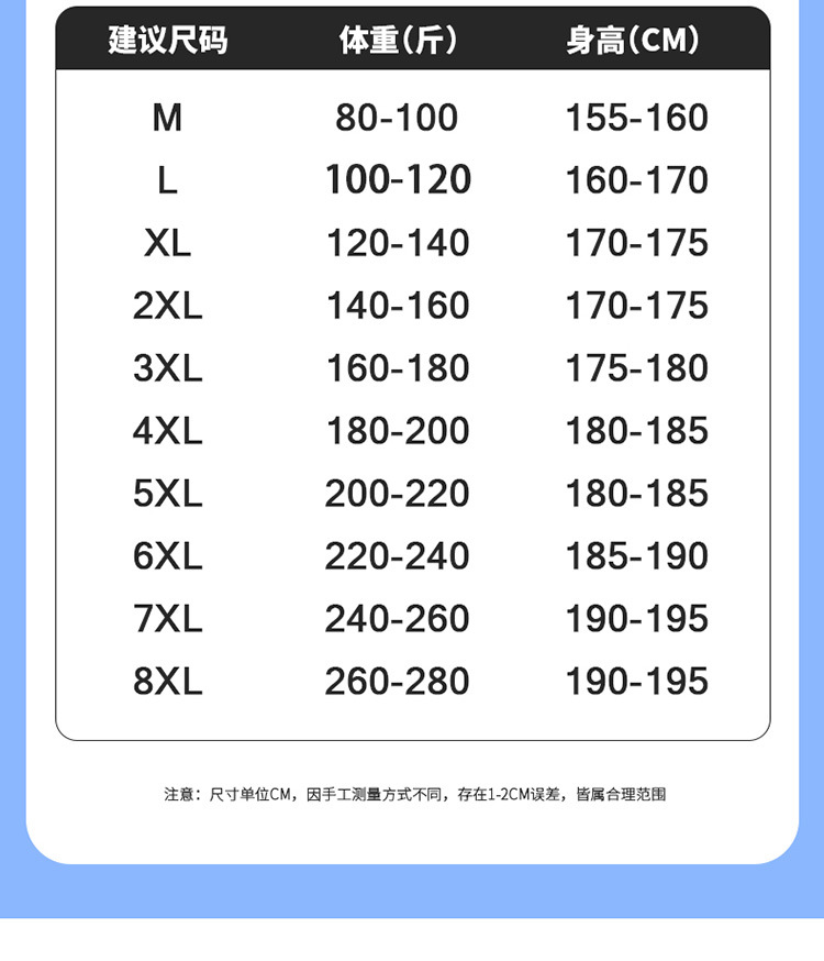 | Talla | M,L,XL,2XL,3XL,4XL,5XL,6XL,7XL,8XL |