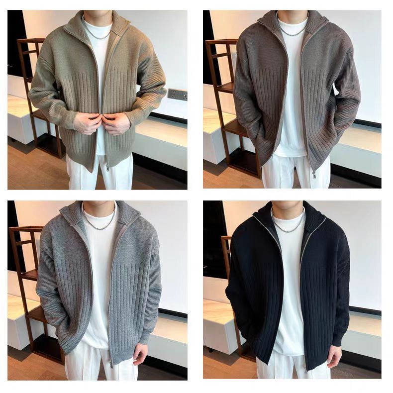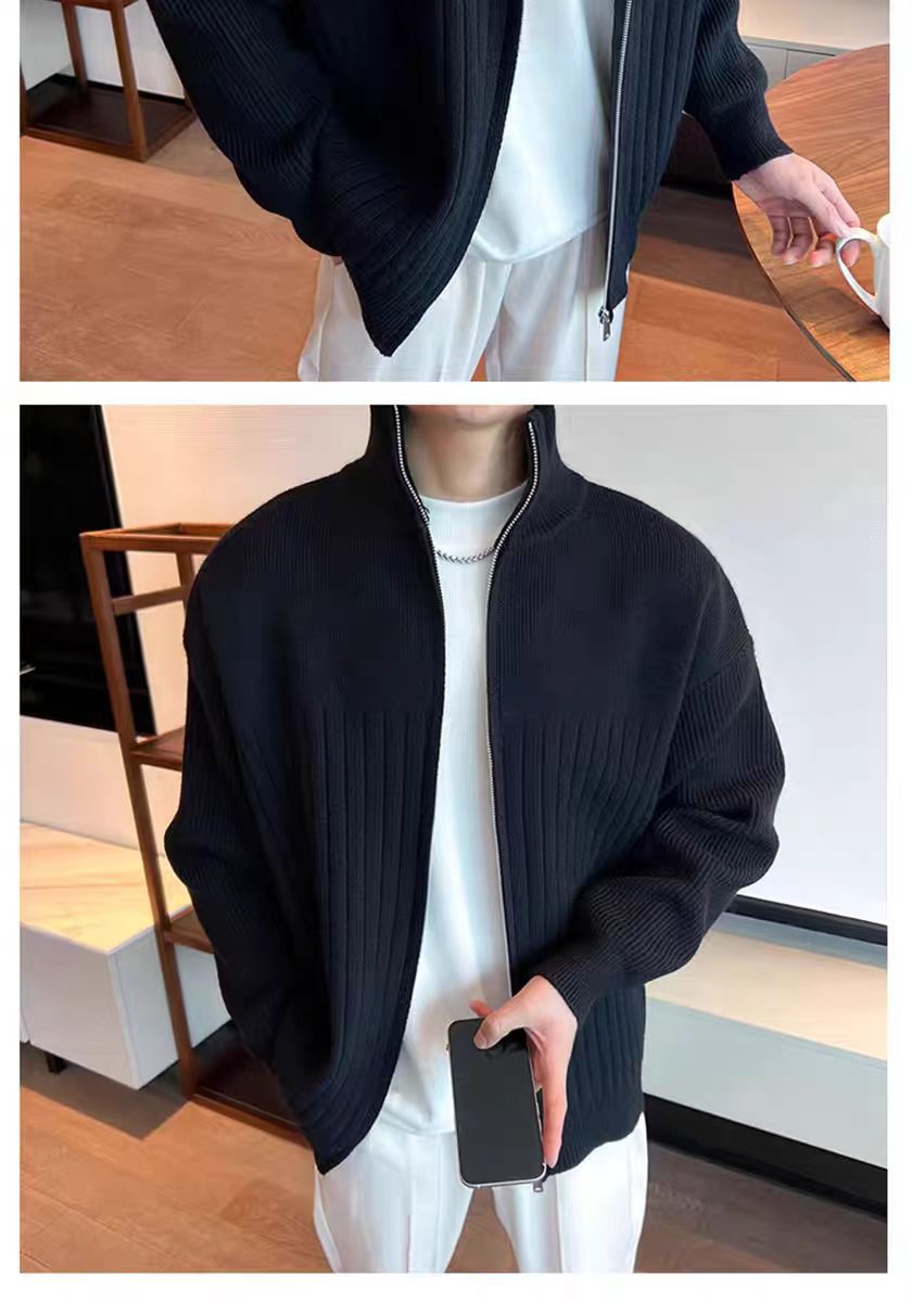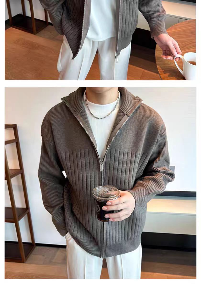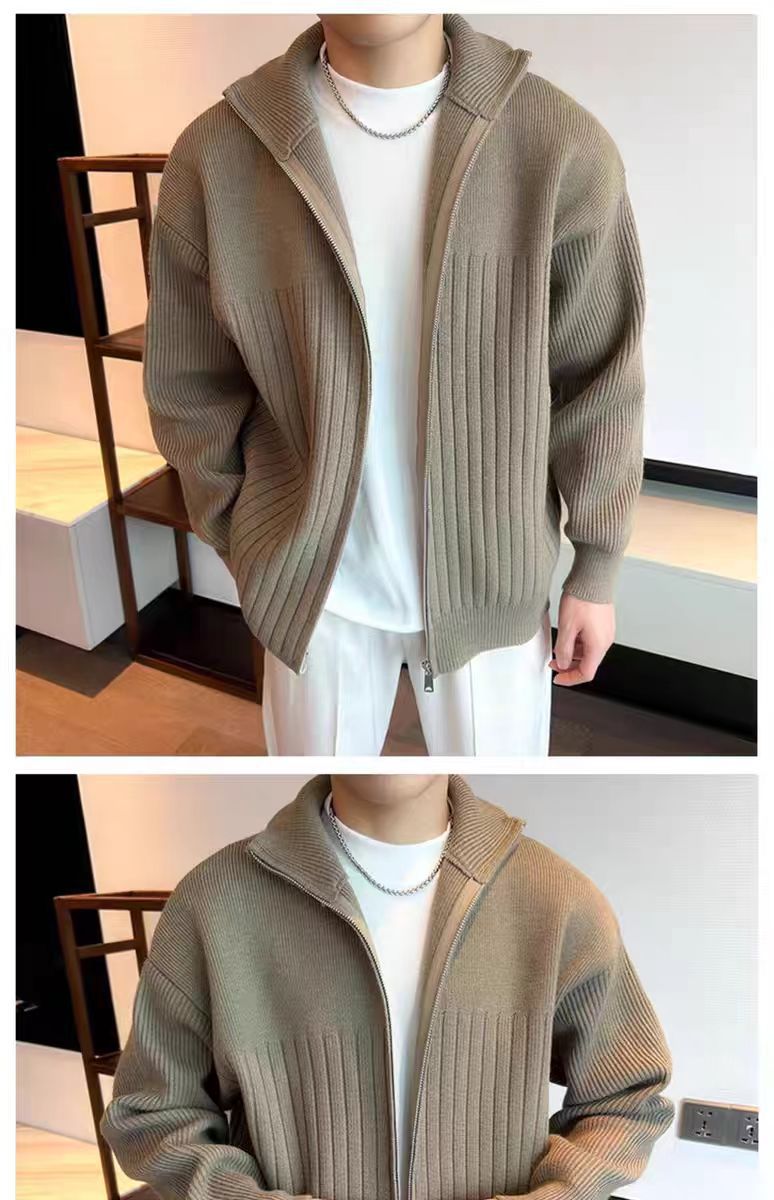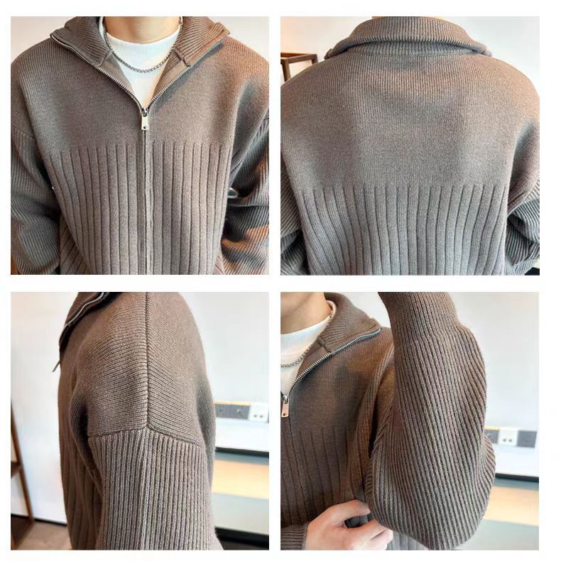 Color sólido retro holga camisa de punto suéter de cuello alto de hombre con cremallera de cuello de moda cardigan chaqueta de alta calidad simple