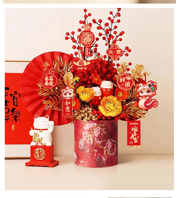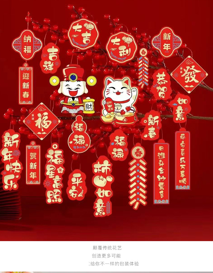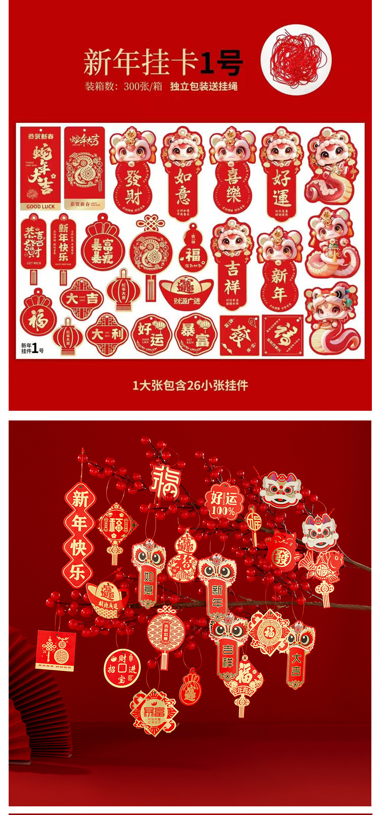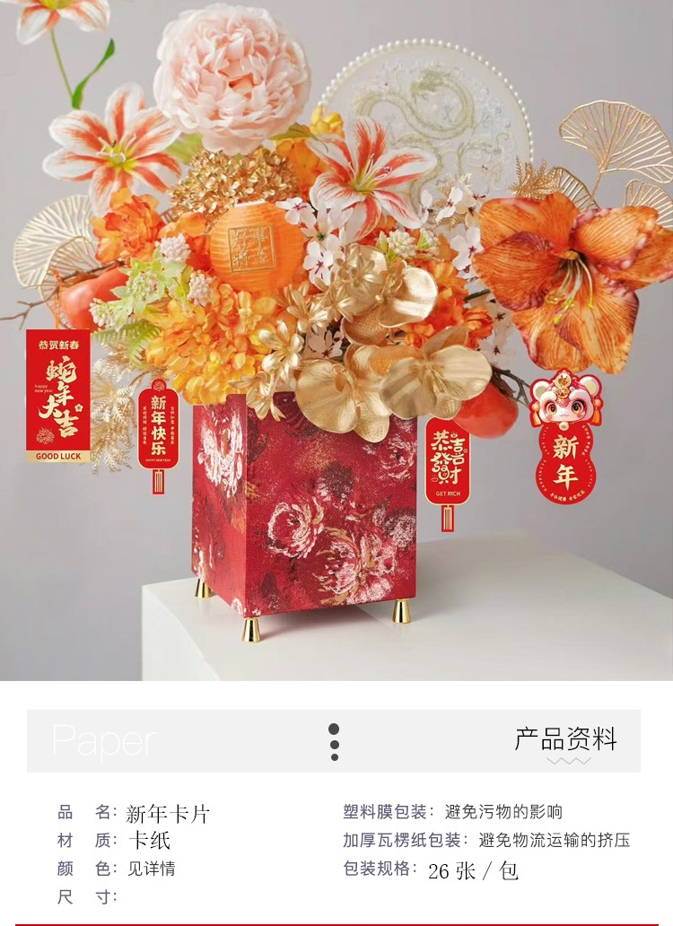 | Tamaño | 红色吊绳(100根/包),2号卡 12张,6号卡 16张,7号卡 14张,8号卡 12张,9号卡 12张,10号卡 14张,13号卡 12张,14号卡 12张,18号卡 16张,新年挂卡1号 19张,新年挂卡2号 22张,新年挂卡3号 24张,红色挂卡16张含吊绳+吊穗,粉色挂卡16张含吊绳+吊穗,紫色挂卡16张含吊绳+吊穗,醒狮吊卡90张送吊绳,书法卡12张,异形卡片16张,时来运转烫金卡(76小张),红色财神卡 8张,米色财神卡 8张,烫金卡12张,锦鲤卡12张,烫金粉色 12张,烫金紫色 12张,烫金红色 12张,粉色锦鲤吊卡2个/包,红色锦鲤吊卡2个/包,紫色锦鲤吊卡2个/包,福禄卡紫色2个/包,福禄卡粉色2个/包,福禄卡青色2个/包,福禄卡红色2个/包,宋锦卡大吉2个/包,宋锦卡平安2个/包,宋锦卡好运2个/包,宋锦卡喜乐2个/包,平安喜乐卡 48张,平安贴纸 76小张,醒狮小号2个/包,红色鲤鱼一个,流苏大红5个/包,流苏酒红5个/包,流苏浅粉5个/包,流苏浅紫5个/包,流苏军绿5个/包,流苏橙色5个/包,福包浅紫一个,福包浅粉一个,福包红色一个,福包绿色一个,福包橙色一个,5cm蜂窝球浅蓝5个/包,5cm蜂窝球浅粉5个/包,5cm蜂窝球红色5个/包,5cm蜂窝球黄粉5个/包,木头挂件红色混款12个/包,金色福字2个/包,金色发字2个/包,金色灯笼球5个/包,6盘中国结红色 10个,福字结红色 5个,五帝铜钱结红色 5个,蓝色蛇一个,酒红葫芦一个,粉色葫芦一个,紫色葫芦一个,蓝色葫芦一个,橙色葫芦一个,红色葫芦一个,双拼流苏大红 1个,双拼流苏酒红 1个,双拼流苏粉紫 1个,双拼流苏粉绿 1个,双拼流苏酒红蓝 1个,双拼流苏土黄咖 1个,红色花灯 2个/包,粉色花灯 2个/包,白红花灯 2个/包 |