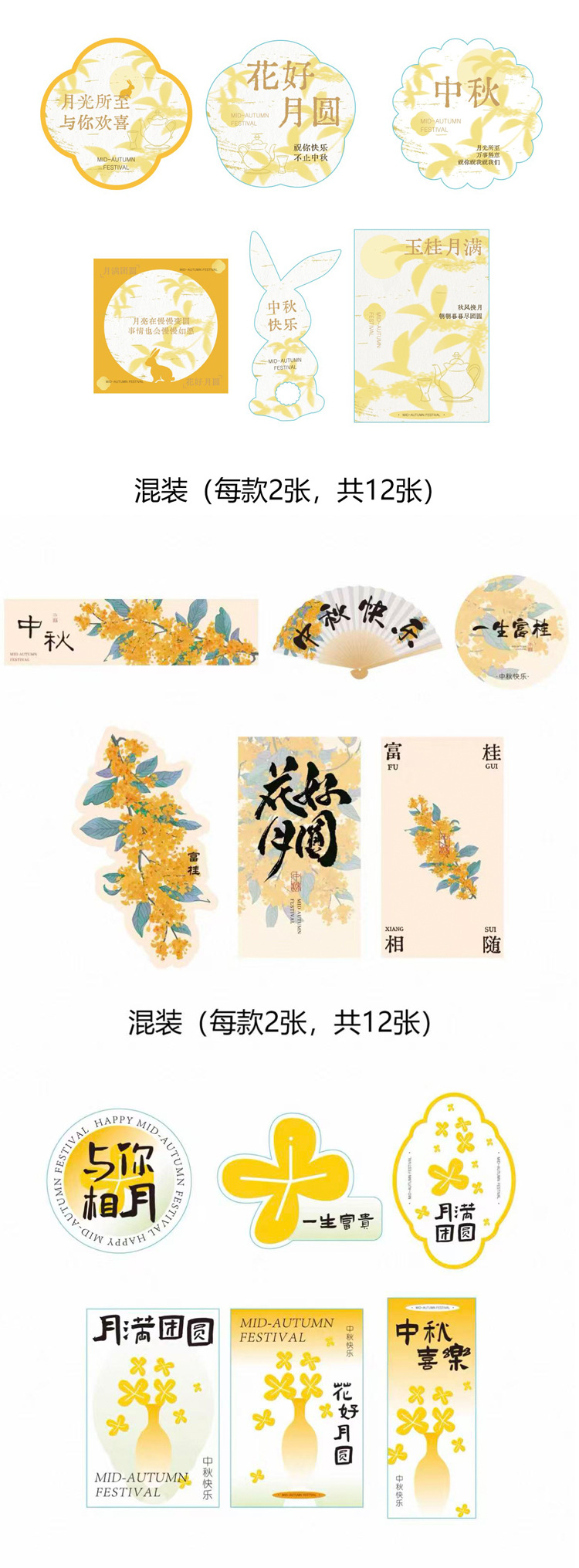 | Tamaño | Tarjeta de ventilador del Medio Otoño 24, tarjeta de luna llena de 24 pequeñas hojas, tarjetas de acompañamiento de 12 pequeñas hojas, tarjetas de fijación de oro, 12 pequeñas hojas de luna llena de otoño dorado, tarjetas de fijación de 56 hojas, tarjetas de luna llena de montañas, pegatinas redondas, pegatinas rectangulares 16, tarjetas de fijación de 40 hojas, tarjetas rectangulares 2, 8 hojas de fijación, tarjetas de fijación de 4 hojas de fijación |