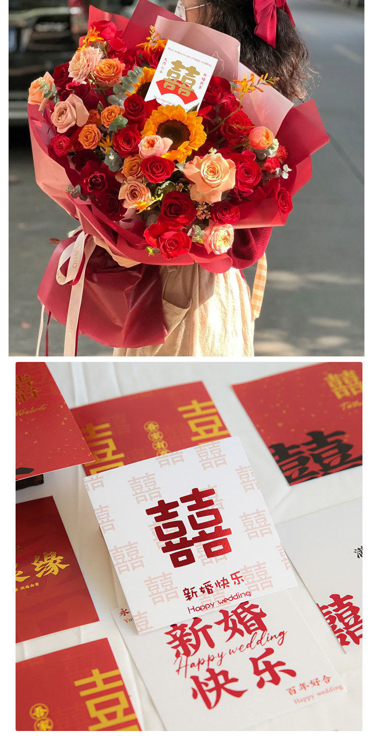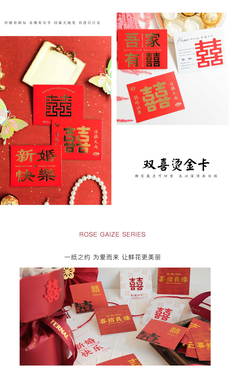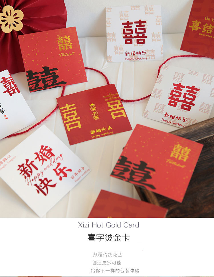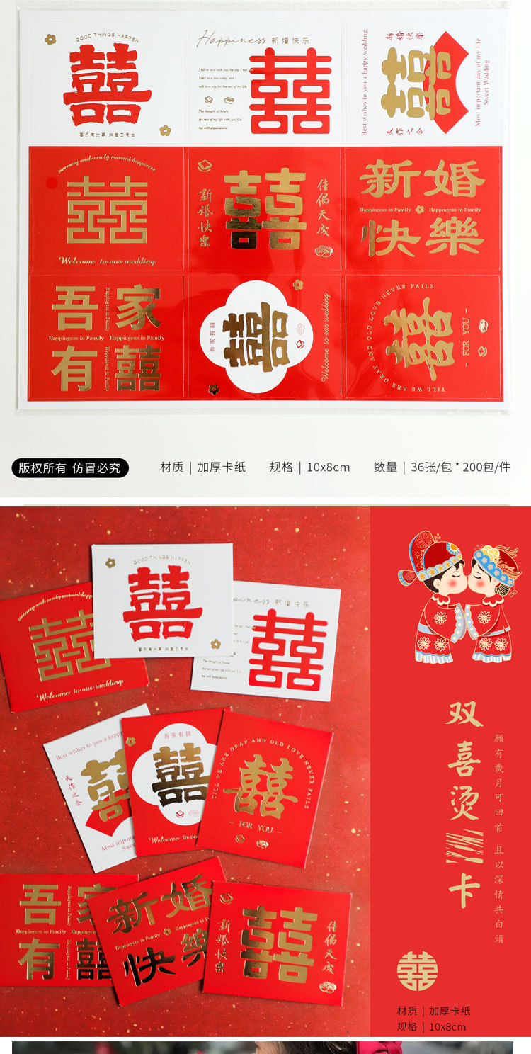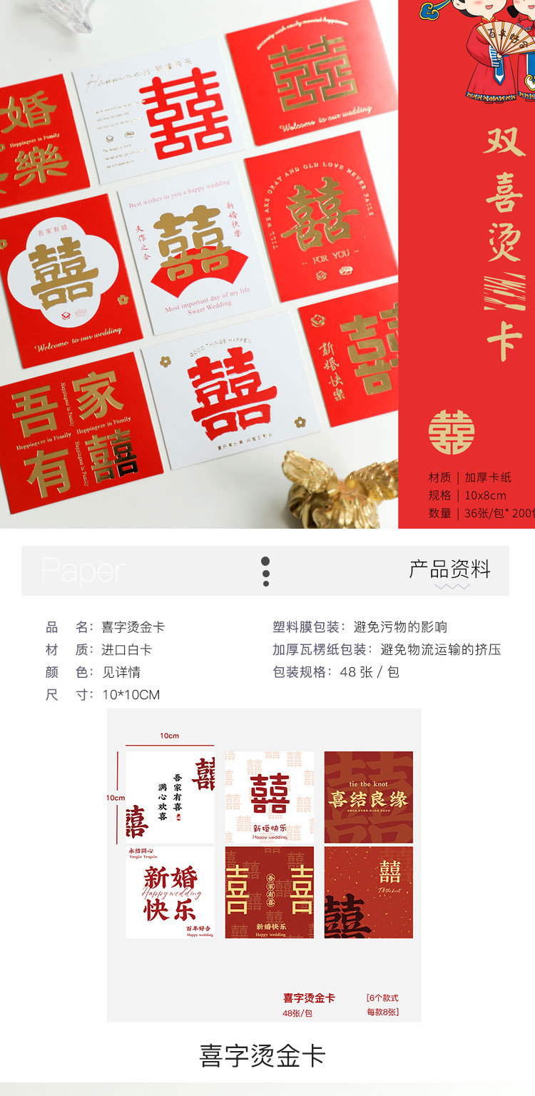 | Tamaño | 36 tarjetas de estampado de oro de doble alegría, 48 tarjetas de boda, 20 tarjetas colgantes de celebración, Fang Xi 4.8 * 4.8cm 50, yuan Xi 4.8 * 4.8cm 40 |