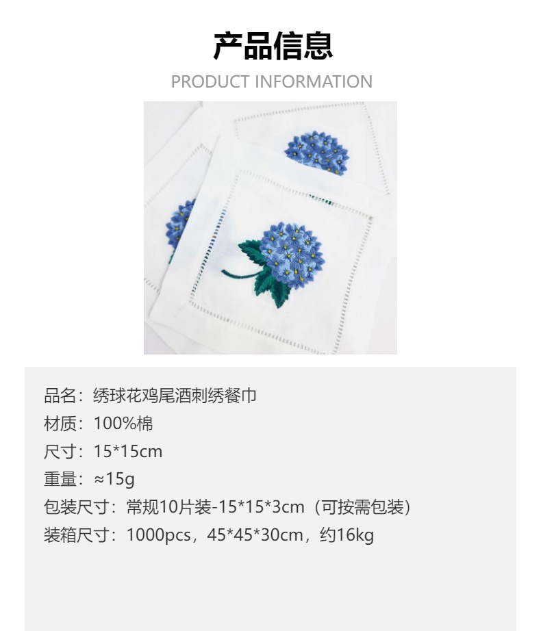 | Color | Hydrangea en stock (una pieza), servillas en blanco (se puede personalizar 100 piezas a pedido) |