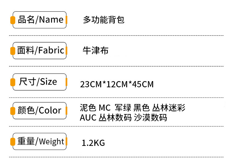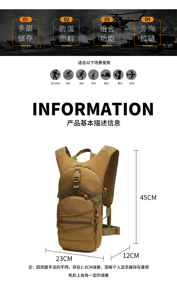 | Color | Negro, barro, verde militar, camuflaje CP, camuflaje ACU, camuflaje jungle, jungle digital, desert digital |