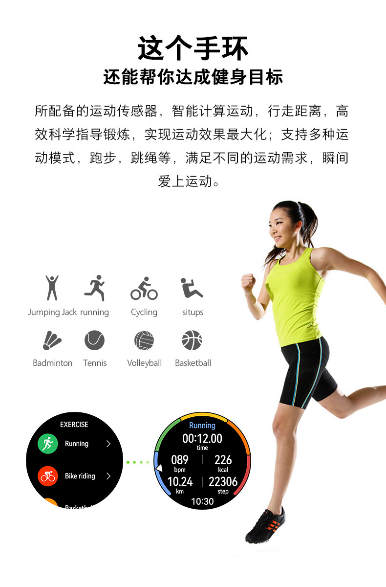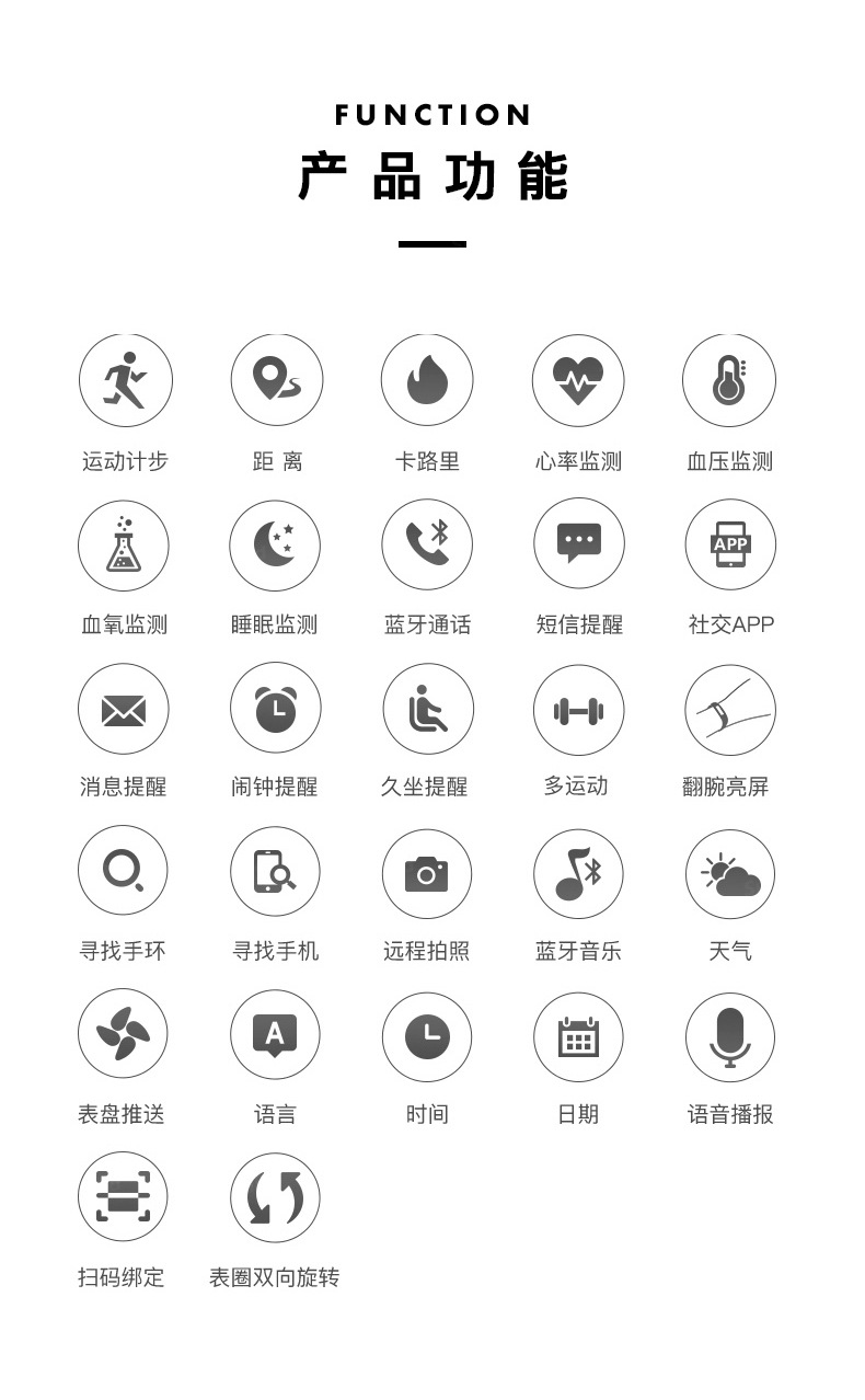 | Función | Contador de pasos, monitoreo de frecuencia cardíaca, entretenimiento social, llamadas bluetooth, recordatorio inteligente, selfie remoto |