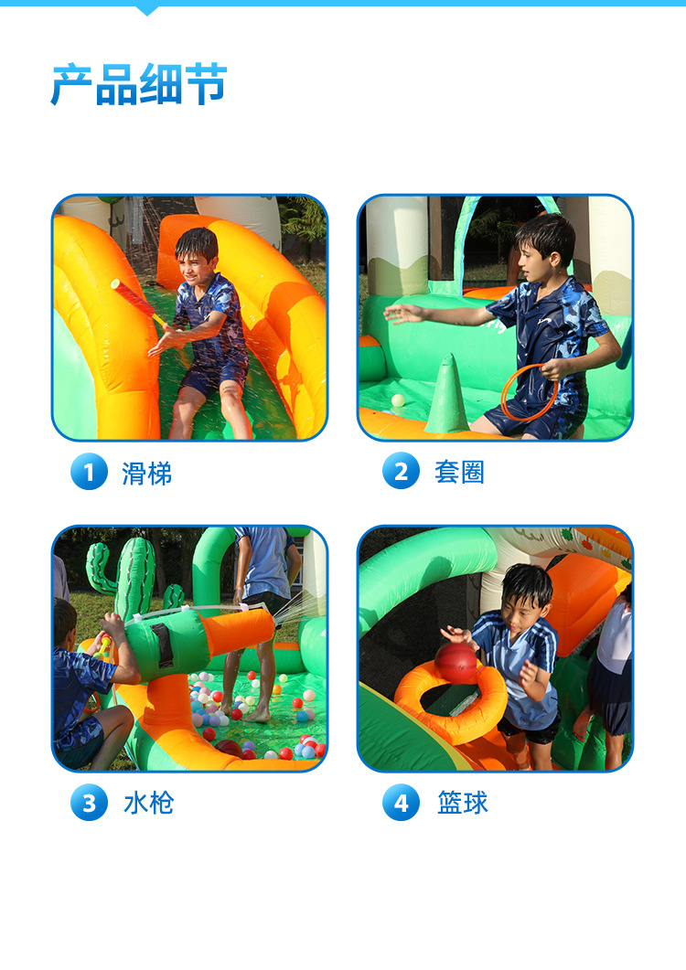 【产品功能】:产品具有攀爬、弹跳、滑梯、钻、跃等功能,供儿童自由玩耍,符合儿童好奇,活泼、的童真性格特点。舒适、柔软的跳面,让儿童受到安全的保护。