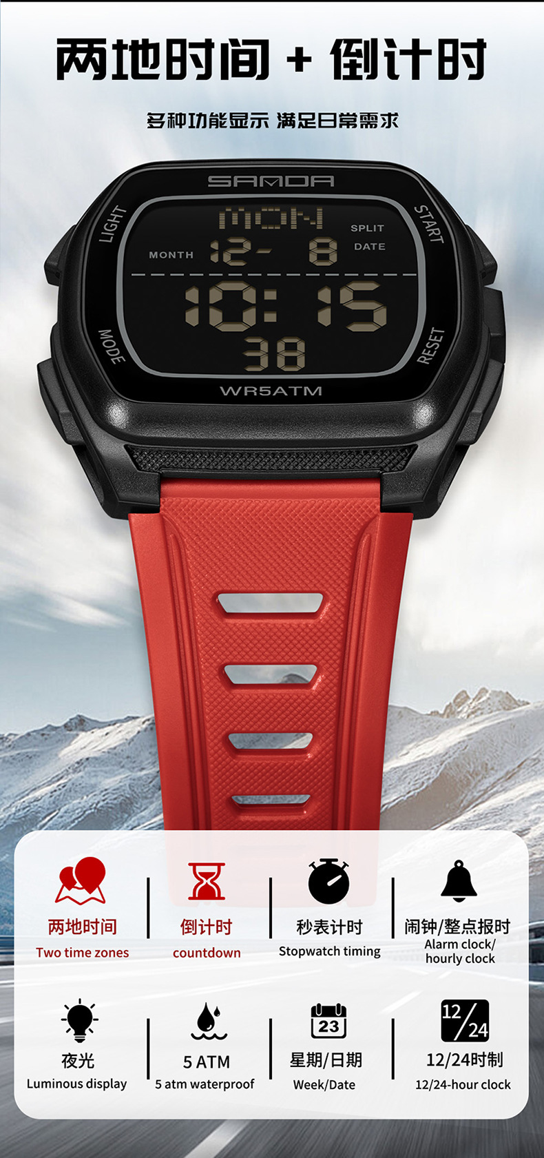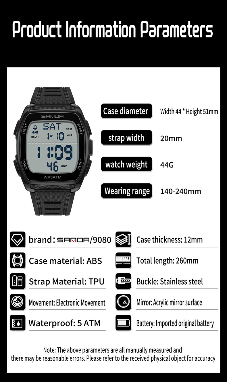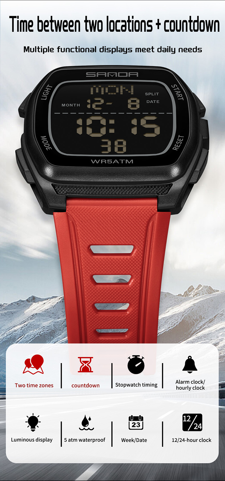 | Funciones Especiales | Hora bi-local, función de luz nocturna, cuenta regresiva, cronómetro, alarma / hora entera, calendario domingo, 12 / 24 horas |