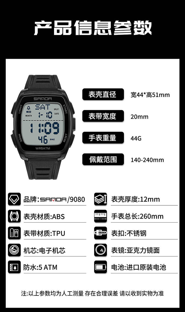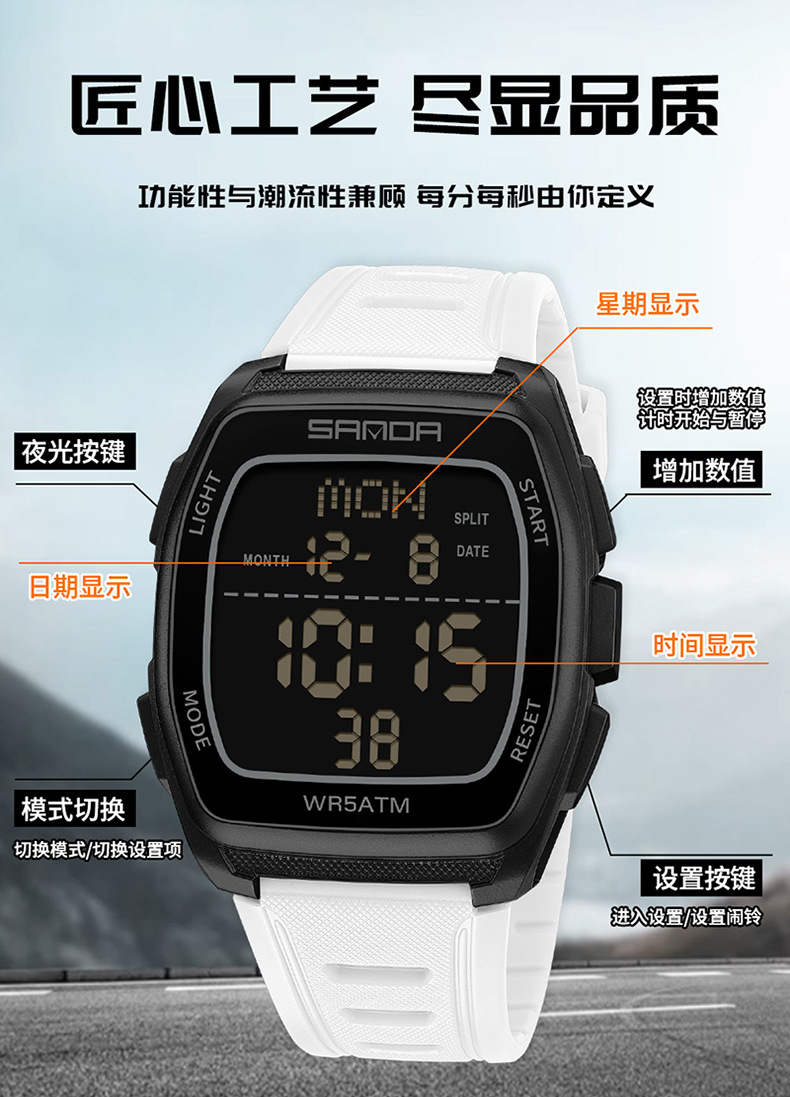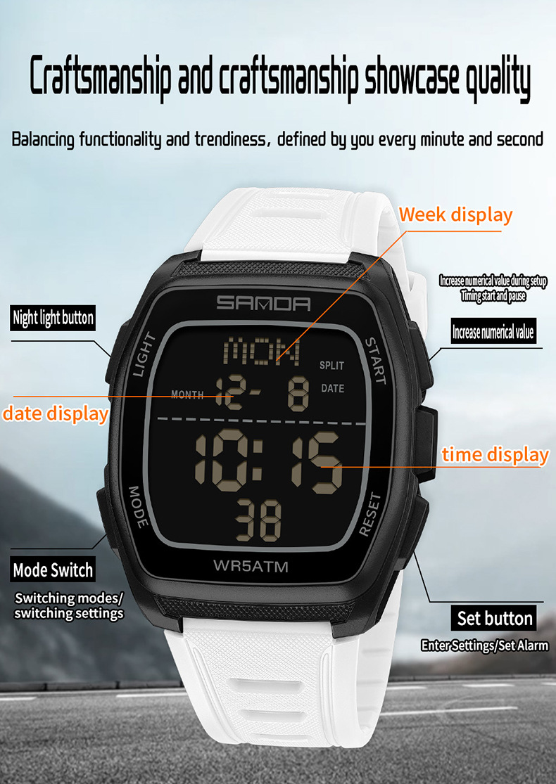 | Funciones Especiales | Hora bi-local, función de luz nocturna, cuenta regresiva, cronómetro, alarma / hora entera, calendario domingo, 12 / 24 horas |
