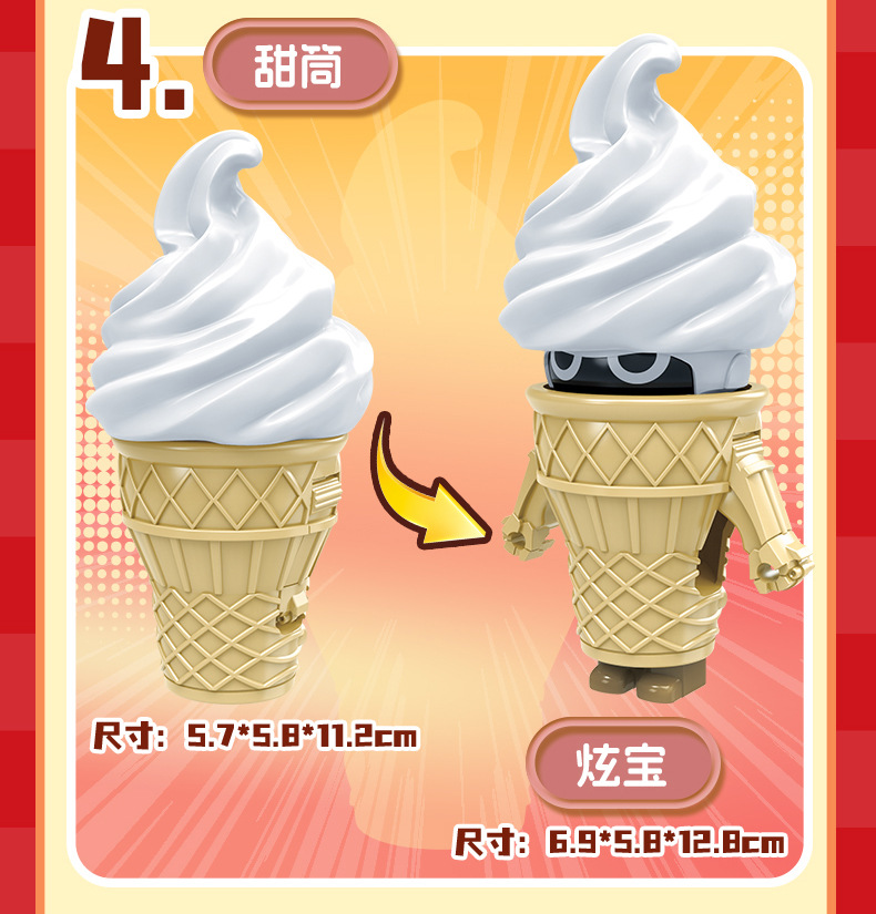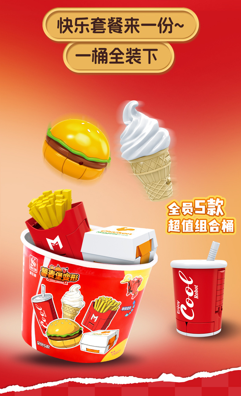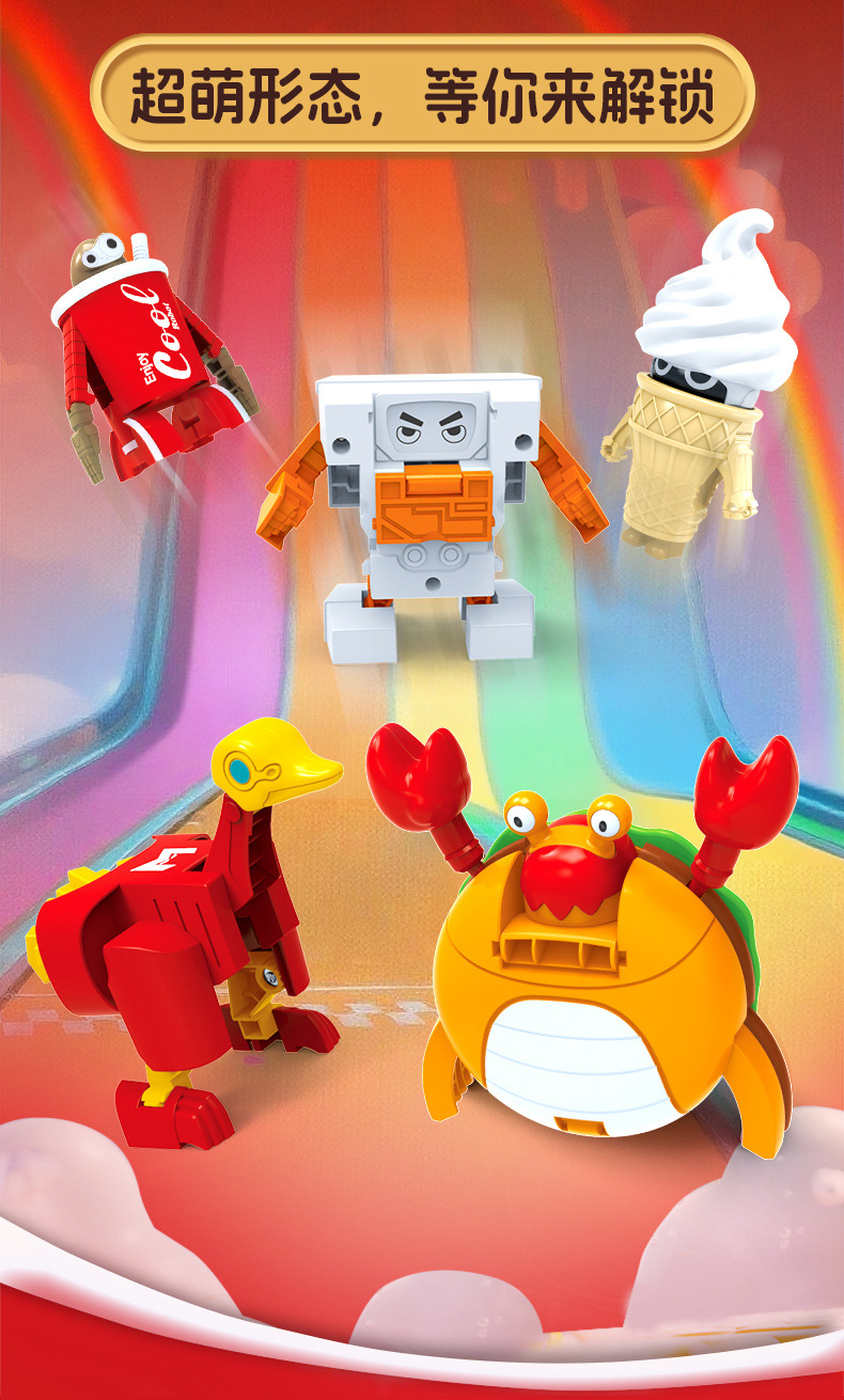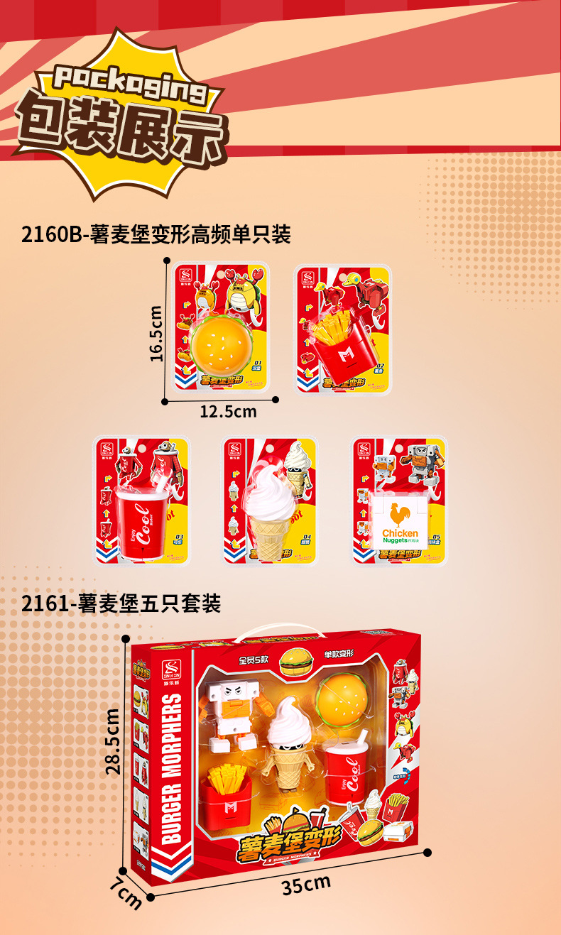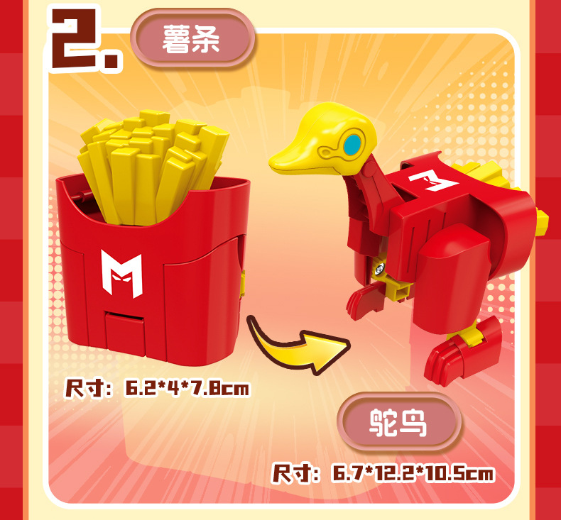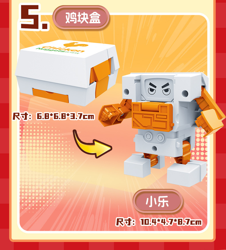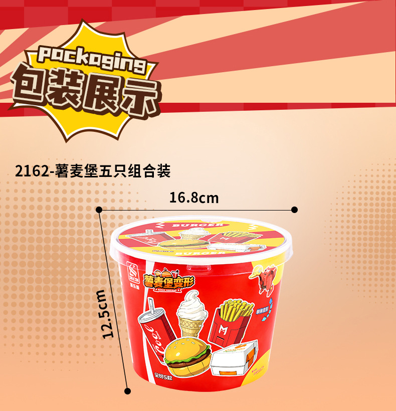 | Color | Hamburguesa transformada, patatas fritas transformadas, cola transformada, helado transformado, pollo transformado, caja de colores 5 en 1 (requiere 5 cajas para distribuir), fideos de burbujas 5 en 1 (requiere 5 cajas para distribuir) |
