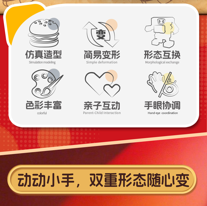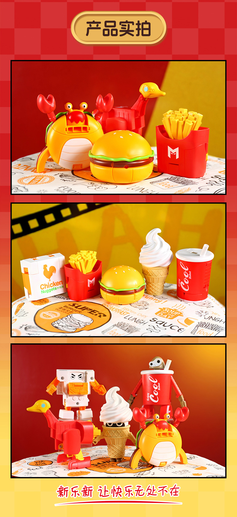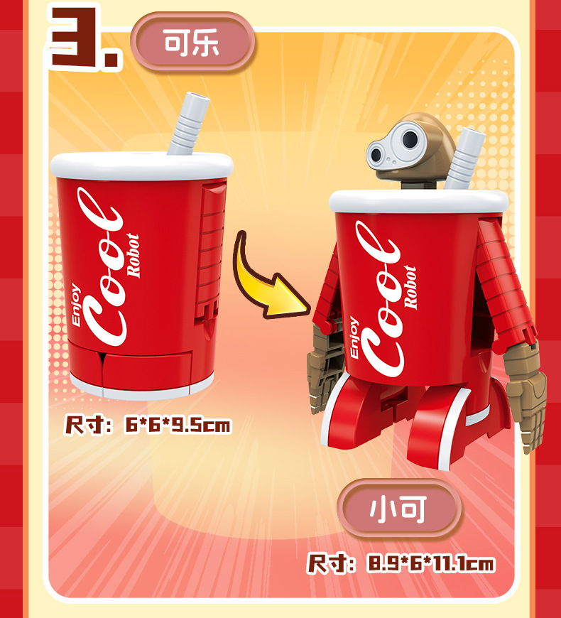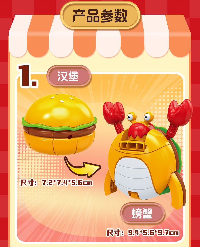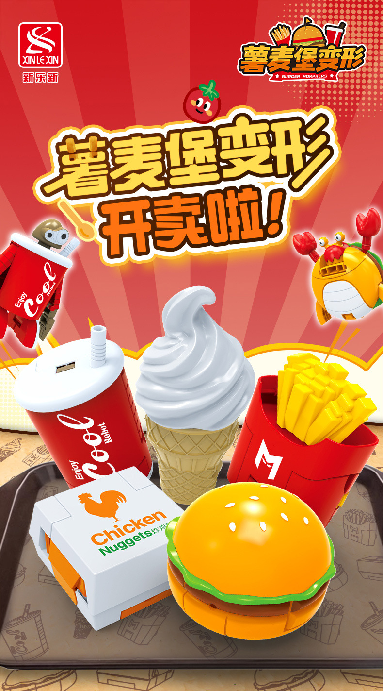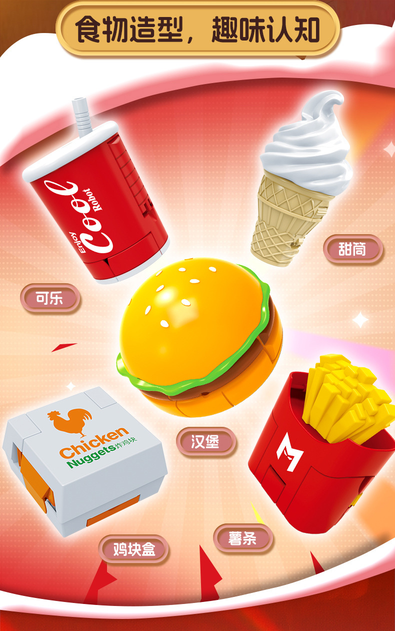 | Color | Hamburguesa transformada, patatas fritas transformadas, cola transformada, helado transformado, pollo transformado, caja de colores 5 en 1 (requiere 5 cajas para distribuir), fideos de burbujas 5 en 1 (requiere 5 cajas para distribuir) |