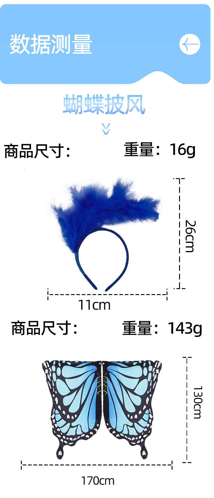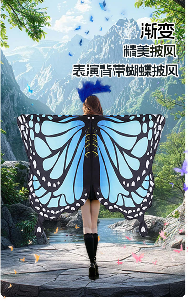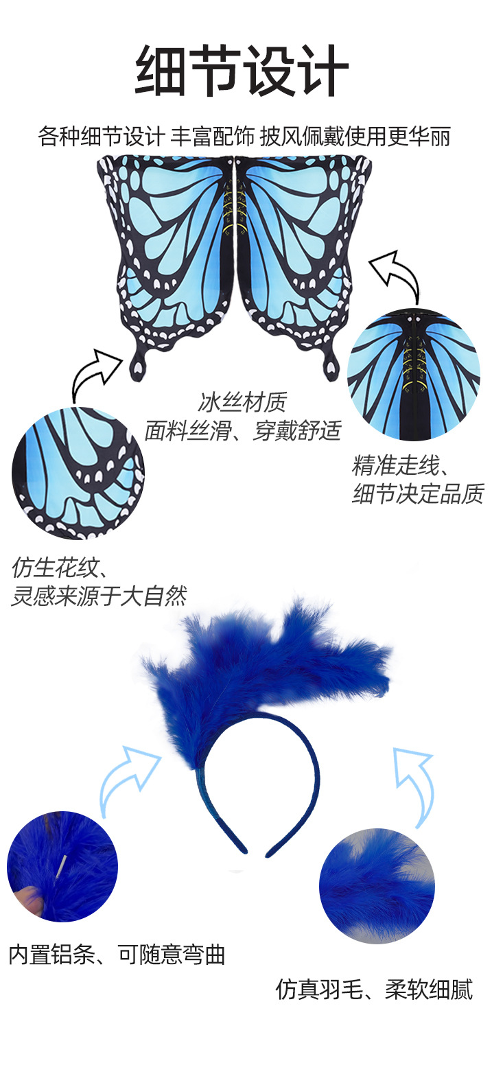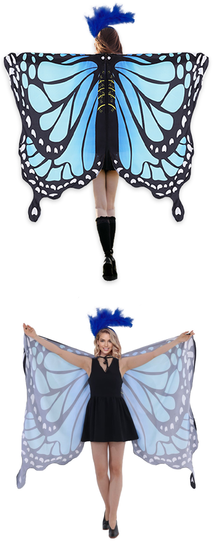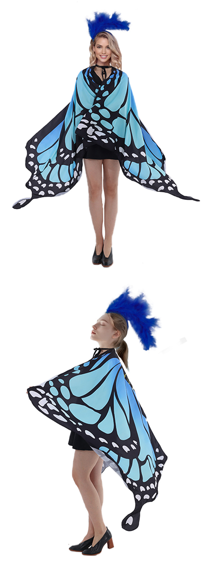 | Color | Capa de gradiente de mariposa + cabello [azul], capa de gradiente de mariposa [azul], cabello de plumas [azul] |
