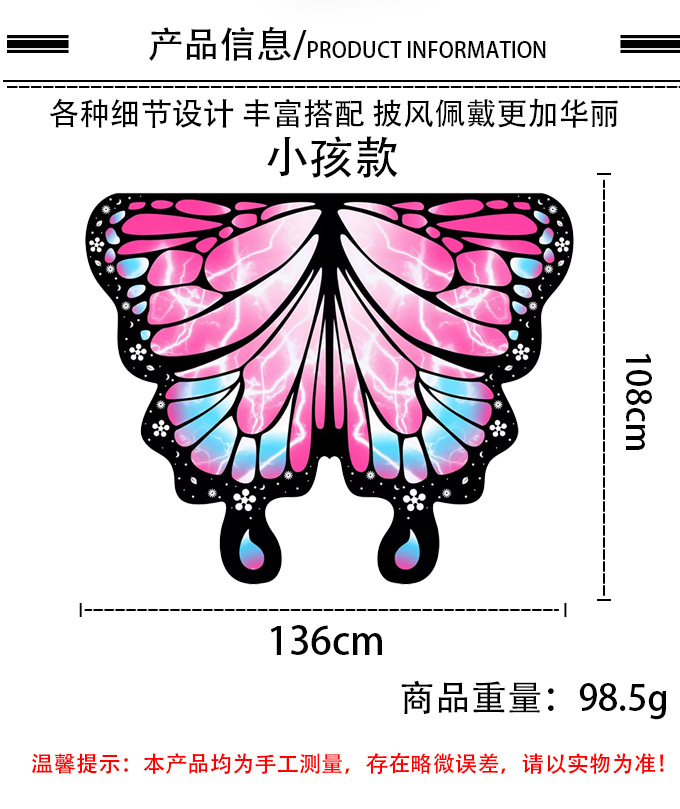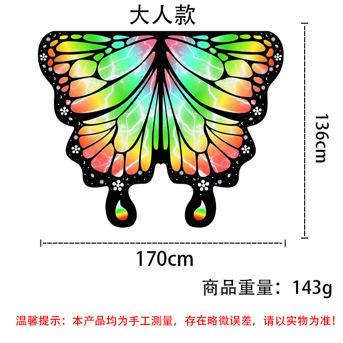 | Color | Capa de mariposa [azul rosa], capa de mariposa [azul violeta], capa de mariposa [azul violeta], capa de mariposa [color], capa de mariposa [azul], capa de mariposa para niños [136x108cm], capa de mariposa para adultos [170x136cm] |