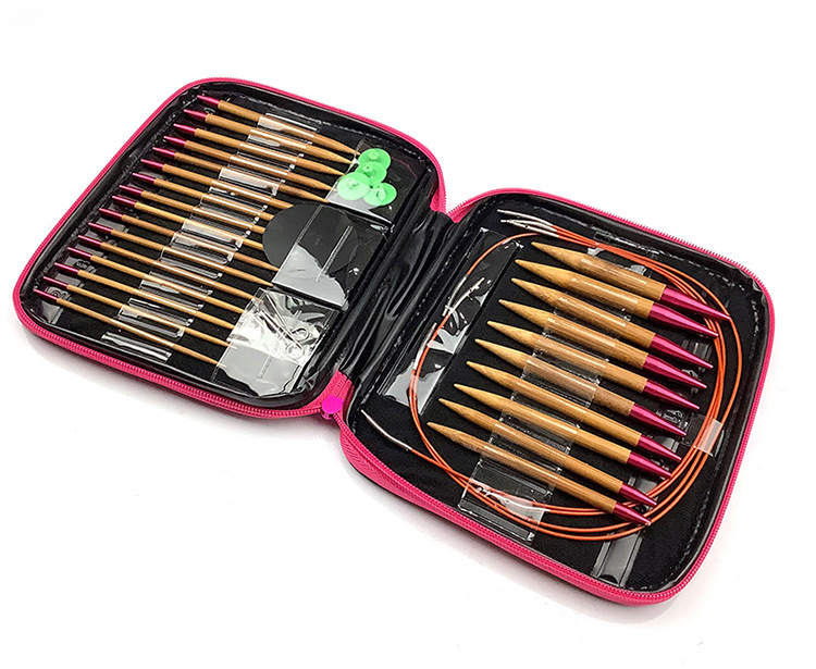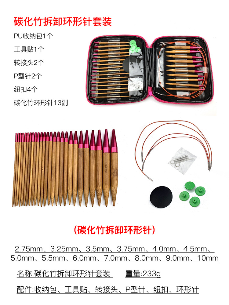 Suéter aguja herramienta de tejer cuerda desmontable Cambio de aguja anillo de bambú carbonizado aguja 13 pares conjunto con bolsa de accesorios