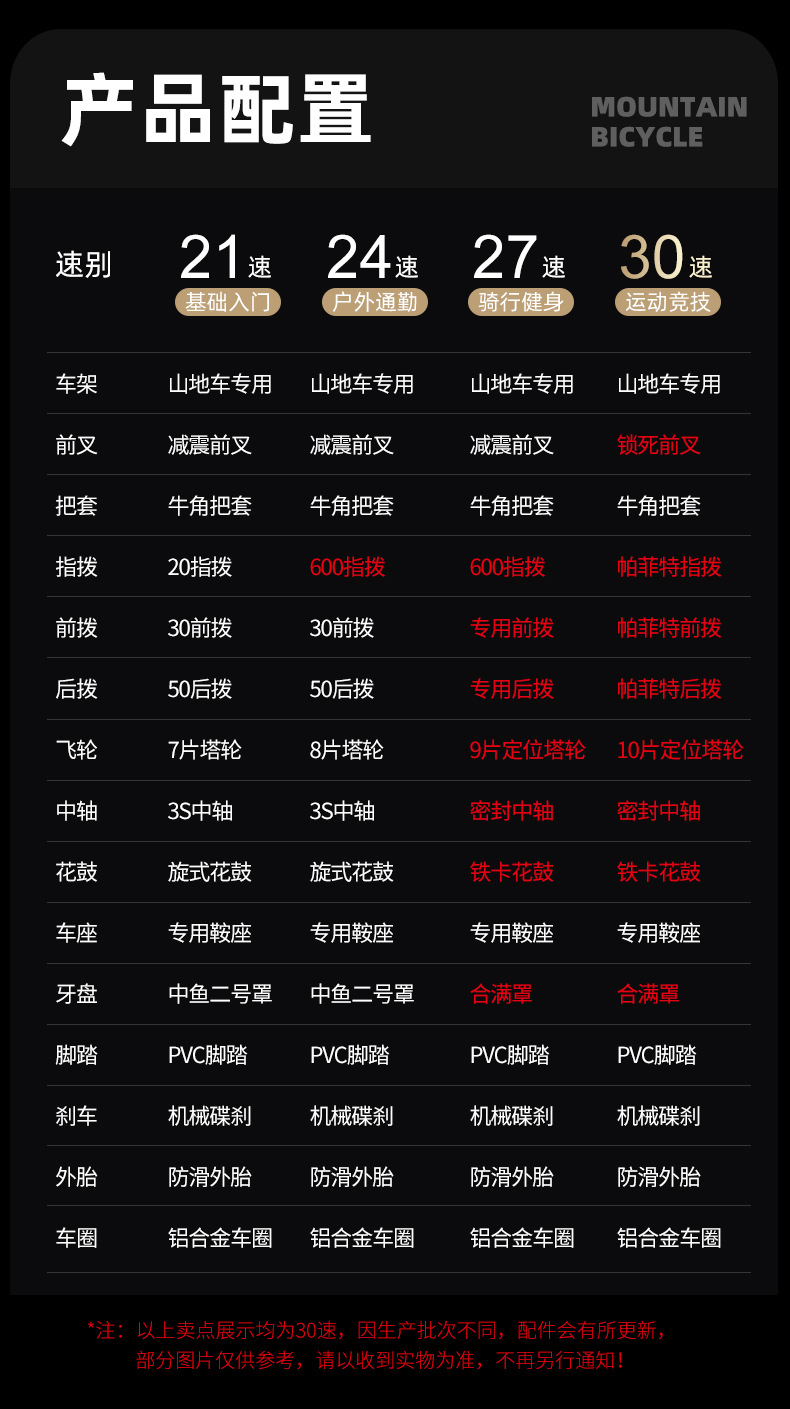 | Tamaño | 26 pulgadas 21 velocidades, 26 pulgadas 24 velocidades, 26 pulgadas 27 velocidades, 26 pulgadas 30 velocidades, 24 pulgadas 21 velocidades, 24 pulgadas 24 velocidades, 24 pulgadas 27 velocidades, 24 pulgadas 30 |