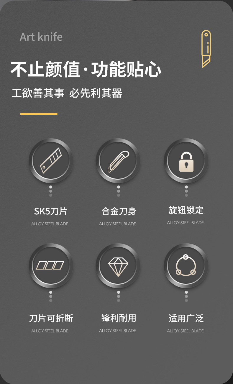| Especificaciones | M32 cuchillo (cuchillo pequeño de 9 mm), M32 cuchillo (cuchillo grande de 18 mm), M32 cuchillo (cuchillo grande de 25 mm), M33 aleación de zinc cuchillo (cuchillo grande de 18 mm), 286 cuchillo grande de 18 mm, pequeño 223 cuchillo pequeño de 9 mm, 120 cuchillo pequeño de 9 mm, 87 cuchillo grande de 18 mm, 80 cuchillo grande de 18 mm, 188 cuchillo grande de 18 mm, M20 cuchillo grande de 18 mm, 7821 cuchillo artístico (18mm cuchillo), cuchillo artístico de cinco cabellos (18mm cuchillo), cuchillo artístico de cinco cabellos encapsulado (18mm cuchillo), cuchillo plegable, cuchillo grande (25mm cuchillo súper gran) |