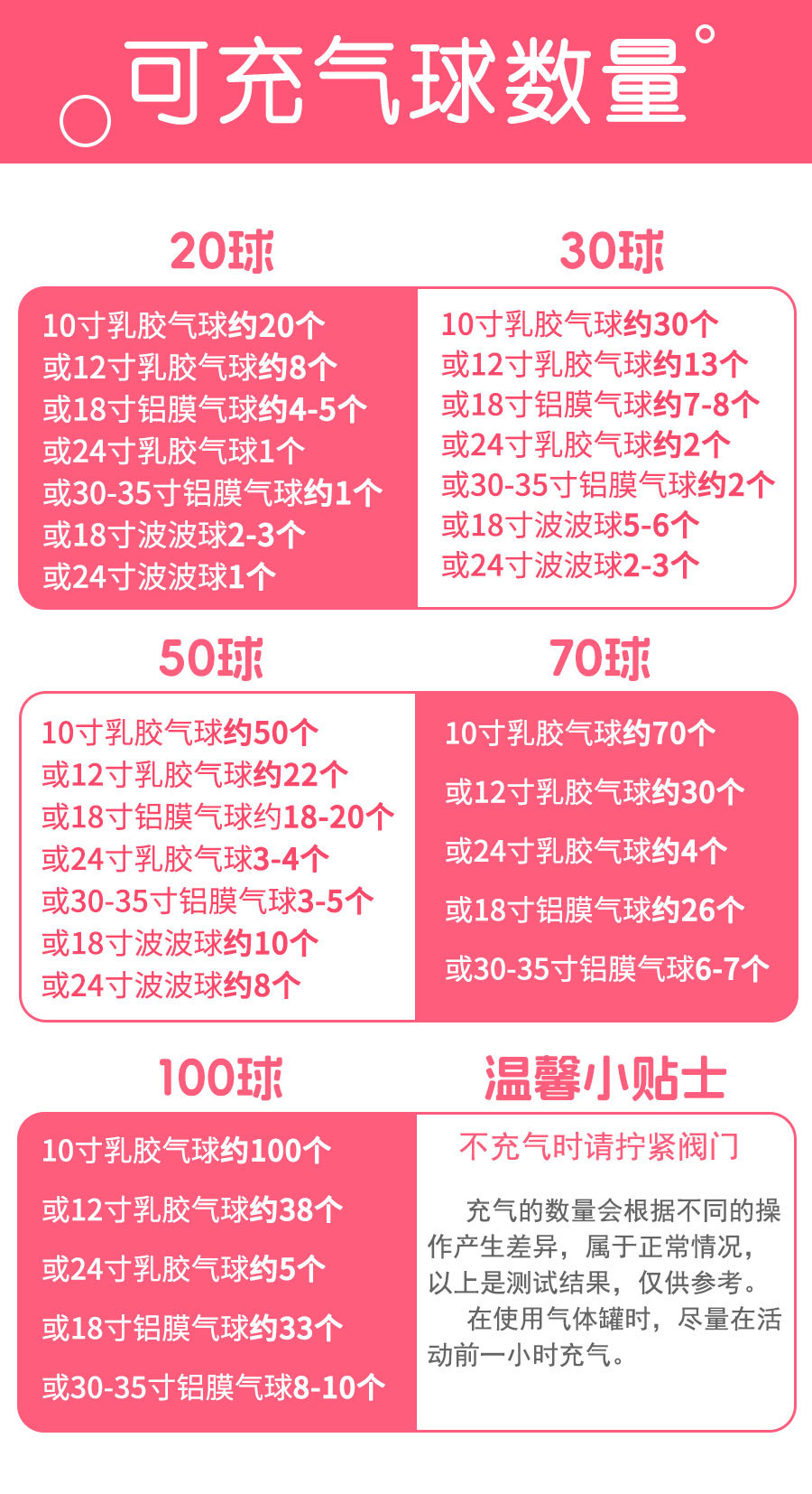 | Color | Tanque de helio de 20 bolas (llenar bolas de látex de 10 pulgadas alrededor de 20), preste atención al tamaño del diámetro de inflación y el tiempo de vuelo, el tanque de helio de 30 bolas (llenar bolas de látex de 10 pulgadas alrededor de 30), tanque de helio de 50 bolas (llenar bolas de látex de 10 pulgadas alrededor de 50), tanque de helio de 70 bolas (llenar bolas de látex de 10 pulgadas alrededor de 70), tanque de helio de 100 bolas (llenar bolas de látex de 10 pulgadas alrededor de 100) gran cantidad recomendado!!, 20 bolas de helio + 20 globos de color macarón + accesorios, 30 bolas de helio + 30 globos de color macarón + accesorios, 30 bolas de helio + 30 globos de color mixto de metal + accesorios, 30 bolas de helio + 30 globos rojos granada + accesorios, 50 bolas de helio + 50 globos de color mixto mate + accesorios, 50 bolas de helio + 50 globos de color mixto de metal + accesorios, 50 bolas de helio + 50 globos de color mixto de metal + accesorios, 50 bolas de helio + 50 globos de color mixto de perla + accesorios, 70 bolas de helio + 70 globos rojos de granada + accesorios, 70 bolas de helio + 70 globos de color mixto de metal + accesorios, 70 bolas de helio + 70 globos de color mixto mate + accesorios, 100 bolas de helio + 100 globos de macarón + accesorios, 100 bolas de helio + 100 globos de color metálico + accesorios, 100 bolas de helio + 100 globos de color rosado + accesorios, Tanque de helio de 100 bolas + 100 globos rojos grandes + accesorios, tanque de helio de 20 bolas + 100 ml de solución protectora, tanque de helio de 30 bolas + 100 ml de solución protectora, tanque de helio de 50 bolas + 100 ml de solución protectora, tanque de helio de 70 bolas + 100 ml de solución protectora, tanque de helio de 100 bolas + 100 ml de solución protectora |