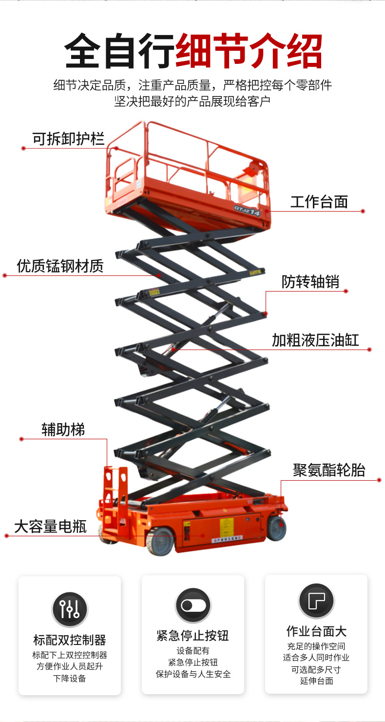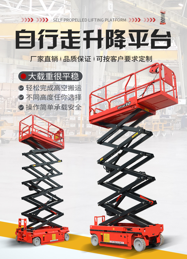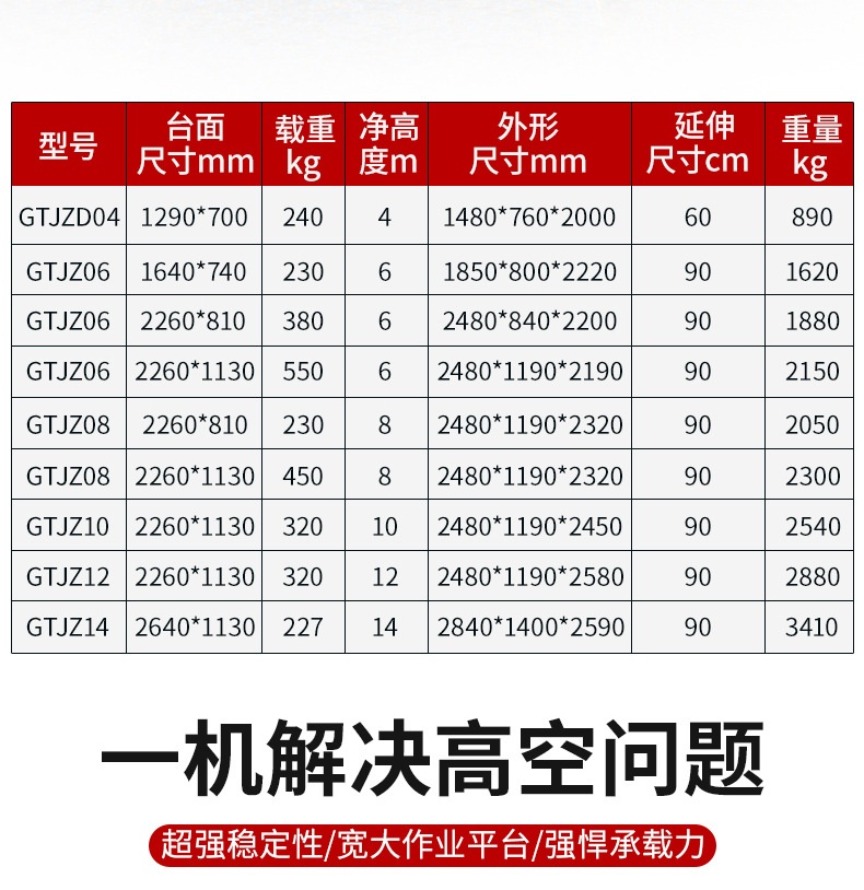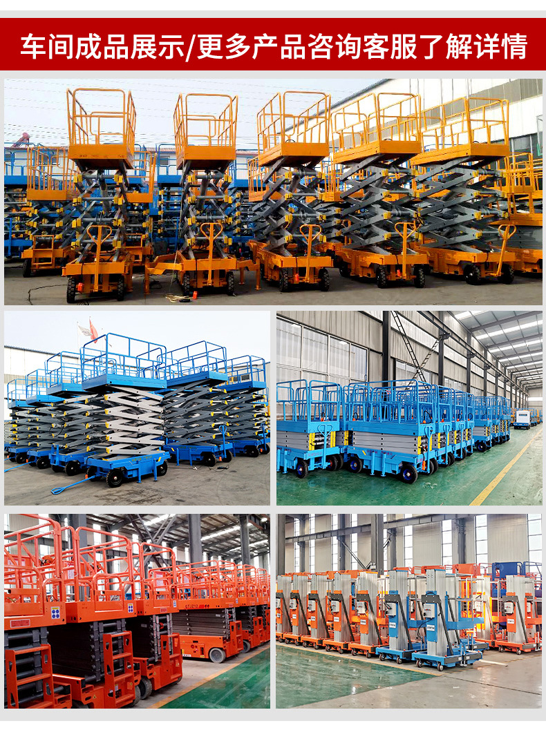 | Modelo | 300 kg - elevación de 3 m - mesa 1170 * 600 mm [modelo de rueda universal], 300 kg - elevación de 3.9 m - mesa 1170 * 600 mm [modelo de rueda universal], 300 kg - elevación de 4.8 m - mesa 1170 * 600 mm [modelo de rueda universal], 300 kg - elevación de 3 m - mesa 1170 * 600 mm [dirección hidráulica], 300 kg - elevación de 3.9 m - mesa 1170 * 600 mm [dirección hidráulica], 300 kg - elevación de 4.8 m - mesa 1170 * 600 mm [dirección hidráulica], 240 kg - elevación de 4 m - mesa 1290 * 700 mm [dirección hidráulica], 230 kg - elevación de 6 m - mesa 1640 * 740 mm [dirección hidráulica], 380 kg - elevación de 6 m - mesa 2260 * 810 mm [dirección hidráulica], 550 kg - elevación de 6 m - mesa 2260 * 1130 mm [dirección hidráulica], 230 kg-elevación de 8 m-superficie 2260 * 810 mm [dirección hidráulica], 450 kg-elevación de 8 m-superficie 2260 * 1130 mm [dirección hidráulica], 320 kg-elevación de 10 m-superficie 2260 * 1130 mm [dirección hidráulica], 320 kg-elevación de 12 m-superficie 2260 * 1130 mm [dirección hidráulica], 227 kg-elevación de 14 m-superficie 2640 * 1130 mm [dirección hidráulica], 320 kg - elevación 16 m - mesa 3000 - 1140 mm [dirección hidráulica], 300 kg - elevación 18 m - mesa 3150 - 1500 mm [dirección hidráulica], 300 kg - elevación 20 m - mesa 3150 - 1500 mm [dirección hidráulica], 240 kg - elevación 6 m - mesa 1670 * 760 mm [auto-track], 320 kg - elevación de 8 m - mesa 2263 * 1129 mm [auto-track], 300 kg - elevación de 10 m - mesa 2271 * 1110 mm [auto-track], 300 kg - elevación de 12 m - mesa 2271 * 1110 mm [auto-track], [piernas plegables manuales personalizadas] [batería de litio personalizada], [nivelación eléctrica personalizada con un botón] [carga grande personalizada],[Seguro conjunto nacional] [Servicio in situ] [Informe de detección + seguro de 5 millones] |