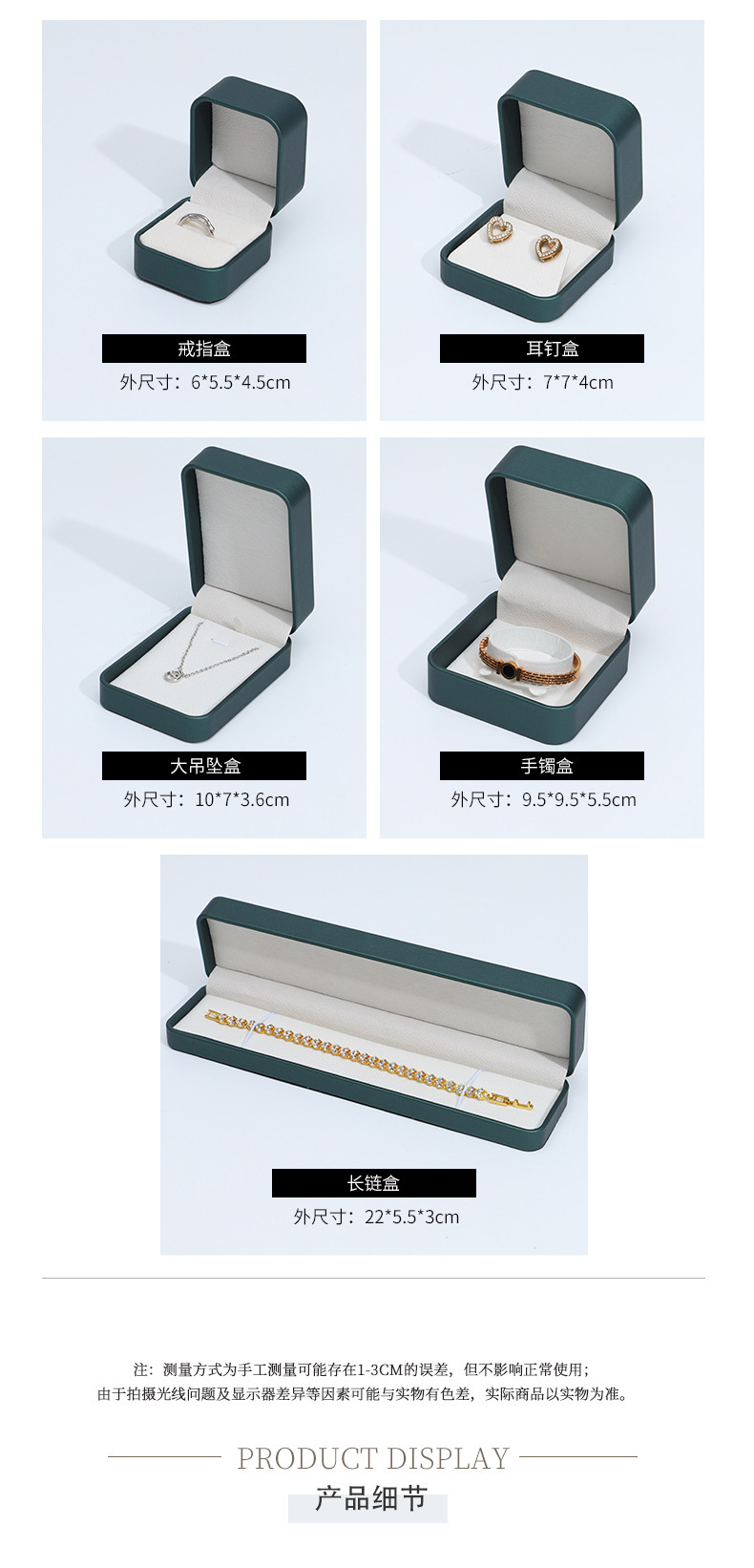 | Modelo de la especificación | Rosa (versión estándar); caja de anillos,Rosa (versión estándar); caja colgante pequeña 7*7*4,5 cm,Rosa (versión estándar); caja colgante grande 10*7*4cm,Rosa (versión estándar); caja pulsera 9.5*9.5*6,Rosa (versión estándar); caja de cadena larga,Rosa (versión estándar); caja para pendientes 7*7*4,5 cm,Verde claro (versión estándar); caja de anillo,Verde claro (versión estándar); caja colgante pequeña 7*7*4,5 cm,Verde claro (versión estándar); caja colgante grande 10*7*4cm,Verde claro (versión estándar); caja pulsera 9.5*9.5*6,Verde claro (versión estándar); caja de cadena larga,Verde claro (versión estándar); caja para pendientes 7*7*4,5 cm,Blanquecino (versión estándar); caja colgante pequeña 7*7*4,5 cm,Blanquecino (versión estándar); caja colgante grande 10*7*4cm,Blanquecino (versión estándar); caja pulsera 9.5*9.5*6,Blanquecino (versión estándar); caja de cadena larga,Blanquecino (versión estándar); caja para pendientes 7*7*4,5 cm,Verde oscuro (versión mejorada); caja de anillo,Verde oscuro (versión mejorada); caja colgante pequeña 7*7*4,5 cm,Verde oscuro (versión mejorada); caja colgante grande 10*7*4cm,Verde oscuro (versión mejorada); caja pulsera 9.5*9.5*6,Verde oscuro (versión mejorada); caja de cadena larga,Verde oscuro (versión mejorada); caja de anillo,Verde malaquita (versión mejorada); caja de anillo,Verde malaquita (versión mejorada); caja colgante pequeña 7*7*4,5 cm,Verde malaquita (versión mejorada); caja colgante grande 10*7*4cm,Verde malaquita (versión mejorada); caja pulsera 9.5*9.5*6,Verde malaquita (versión mejorada); caja de cadena larga,Verde malaquita (versión mejorada); caja de anillos,Rojo granate (versión mejorada); caja de anillo,Rojo granate (versión mejorada); caja colgante pequeña 7*7*4,5 cm,Rojo granate (versión mejorada); caja colgante grande 10*7*4cm,Rojo granate (versión mejorada); caja pulsera 9.5*9.5*6,Rojo granate (versión mejorada); caja de cadena larga,Rojo granate (versión mejorada); caja de anillo,Azul oscuro (versión mejorada); caja de anillo,Azul oscuro (versión mejorada); caja colgante pequeña 7*7*4,5 cm,Azul oscuro (versión mejorada); caja colgante grande 10*7*4cm,Azul oscuro (versión mejorada); caja pulsera 9.5*9.5*6,Azul oscuro (versión mejorada); caja de cadena larga,Tapa Pintada Negra - Anillo; Caja para Anillo,Pulsera con cubierta de pintura negra; caja para pulsera de 9.5*9.5*6,Placa de cubierta pintada de negro - Cadena larga; Caja de cadena larga |