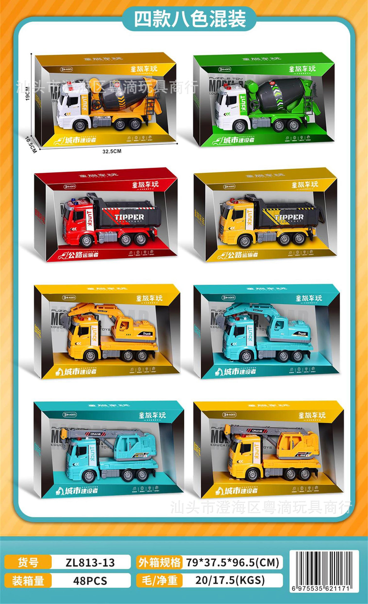 | Color | Camión de cemento - con efectos de luz y sonido (2 colores aleatorios) ZL813-13A, camión basculante - con efectos de luz y sonido (2 colores aleatorios) ZL813-13B, excavadora - con efectos de luz y sonido (2 colores aleatorios) ZL813-13C, grúa - con efectos de luz y sonido (2 colores aleatorios) ZL813-13D |
