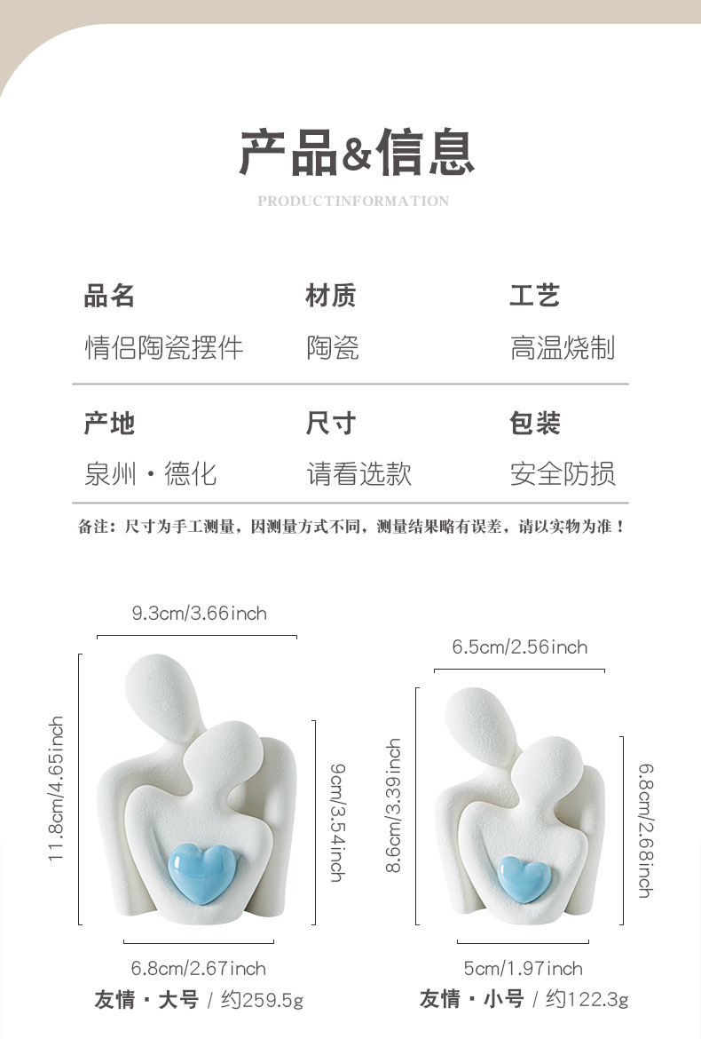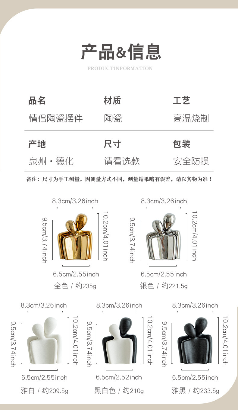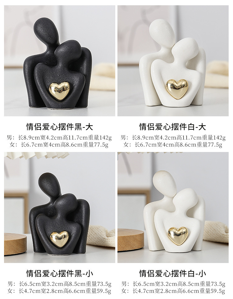 | Color | Blanco mate pequeño, blanco mate medio, negro mate pequeño, negro mate medio, negro mate medio, blanco negro pequeño, blanco negro medio, corazón rojo pequeño, corazón rojo blanco medio, sentado - pareja pequeña, corazón azul pequeño, corazón azul blanco medio, corazón plateado pequeño, corazón plateado medio, abrazar pareja pequeña - oro, abrazar pareja pequeña - blanco, pareja de segunda generación - blanco, pareja de segunda generación - negro, pareja de tercera generación - blanco, pareja de tercera generación - negro, corte pareja pequeña - blanco y negro |