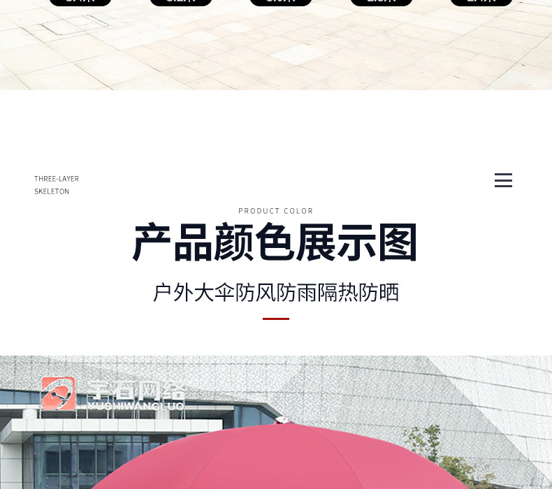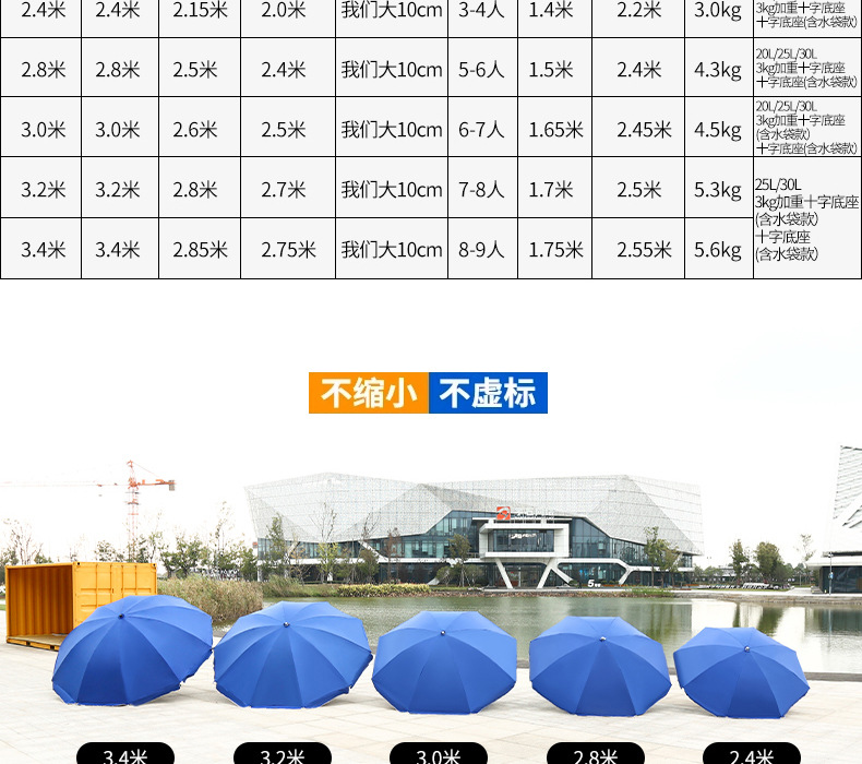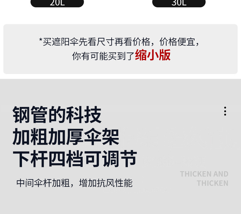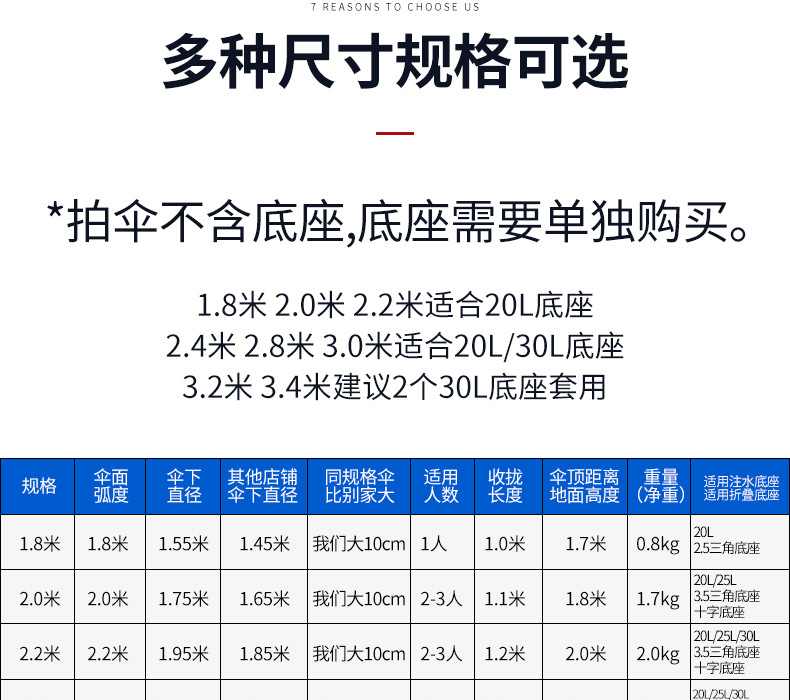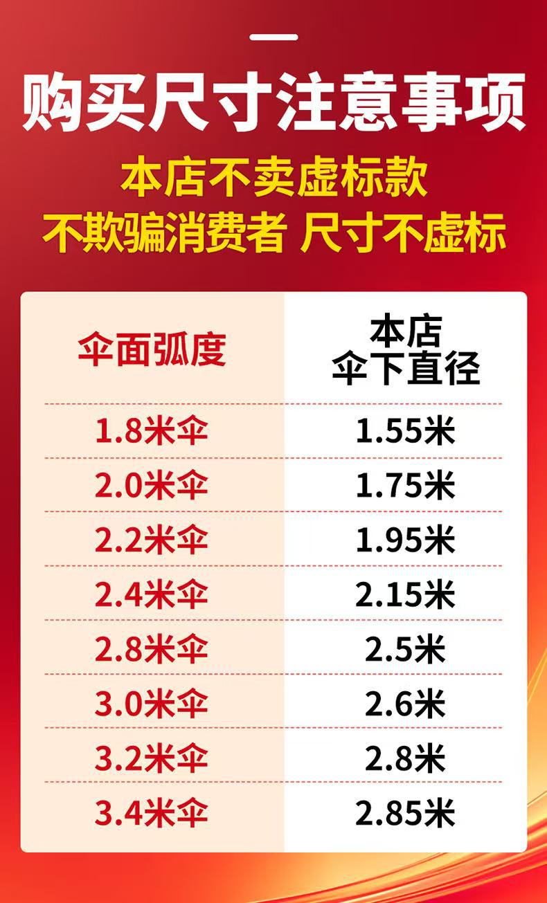 | Color | 高级地插,白色十字底座,四角3.2十字折叠底座,蓝色注水底座,红色注水底座,绿色注水底座,宝蓝1.8米常规伞(最小),宝蓝2.0米加厚牛津,彩虹2.0米加厚牛津,彩虹2.0米加厚牛津(银胶防晒),宝蓝2.0米加厚牛津(银胶防晒),【双层伞面】宝蓝2.0米加厚牛津,【双层伞面】彩虹2.0米加厚牛津,宝蓝2.2米常规骨架(银胶防晒),大红2.2米常规骨架(银胶防晒),【双层伞面】宝蓝2.2米常规骨架(银胶防晒),【双层伞面】大红2.2米常规骨架(银胶防晒),宝蓝2.4米三层架+防风(银胶防晒),墨绿2.4米三层架+防风(银胶防晒),大红2.4米三层架+防风(银胶防晒),酒红2.4米三层架+防风(银胶防晒),【可转向】宝蓝2.4米三层架+防风(银胶防晒),宝蓝2.4米三层架+防风(双层银胶防晒),大红2.4米三层架+防风(双层银胶防晒),酒红2.4米三层架+防风(双层银胶防晒),墨绿2.4米三层架+防风(双层银胶防晒),【双骨】宝蓝2.4米三层架+防风(双层银胶防晒),【双骨】大红2.4米三层架+防风(双层银胶防晒),【双骨】彩虹2.4米三层架+防风(双层银胶防晒),宝蓝2.8米三层架+防风(银胶防晒),大红2.8米三层架+防风(银胶防晒),宝蓝2.8米三层架+防风(双层银胶防晒),大红2.8米三层架+防风(双层银胶防晒),酒红2.8米三层架+防风(双层银胶防晒),墨绿2.8米三层架+防风(双层银胶防晒),【双骨】宝蓝2.8米三层架+防风(双层银胶防晒),【双骨】大红2.8米三层架+防风(双层银胶防晒),【双骨】彩虹2.8米三层架+防风(双层银胶防晒),宝蓝3.0米三层架+防风(银胶防晒),大红3.0米三层架+防风(银胶防晒),墨绿3.0米三层架+防风(银胶防晒),酒红3.0米三层架+防风(银胶防晒),宝蓝3.0米三层架+防风(双层银胶防晒),大红3.0米三层架+防风(双层银胶防晒),墨绿3.0米三层架+防风(双层银胶防晒),酒红3.0米三层架+防风(双层银胶防晒),【双骨】宝蓝3.0米三层架+防风(双层银胶防晒),【双骨】大红3.0米三层架+防风(双层银胶防晒),【双骨】彩虹3.0米三层架+防风(双层银胶防晒),【10骨】宝蓝3.2米三层架+防风(双层银胶防晒),【10骨】酒红3.2米三层架+防风(双层银胶防晒),【10骨】大红3.2米三层架+防风(双层银胶防晒),【10骨】墨绿3.2米三层架+防风(双层银胶防晒),【10骨】宝蓝3.4米三层架+防风(双层银胶防晒),【10骨】大红3.4米三层架+防风(双层银胶防晒),【10骨】酒红3.4米三层架+防风(双层银胶防晒),【10骨】墨绿3.4米三层架+防风(双层银胶防晒) |