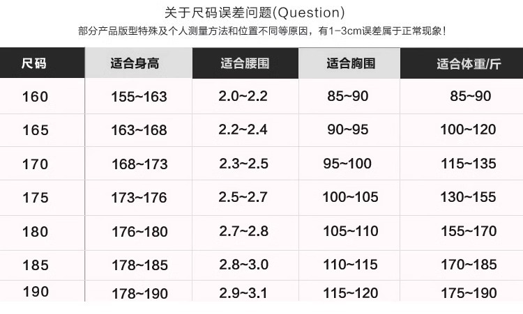| Talla | 160/S,165/M,170/L,175/XL,180/2XL,185/3XL,190/4XL |