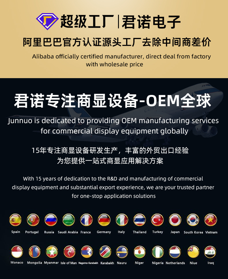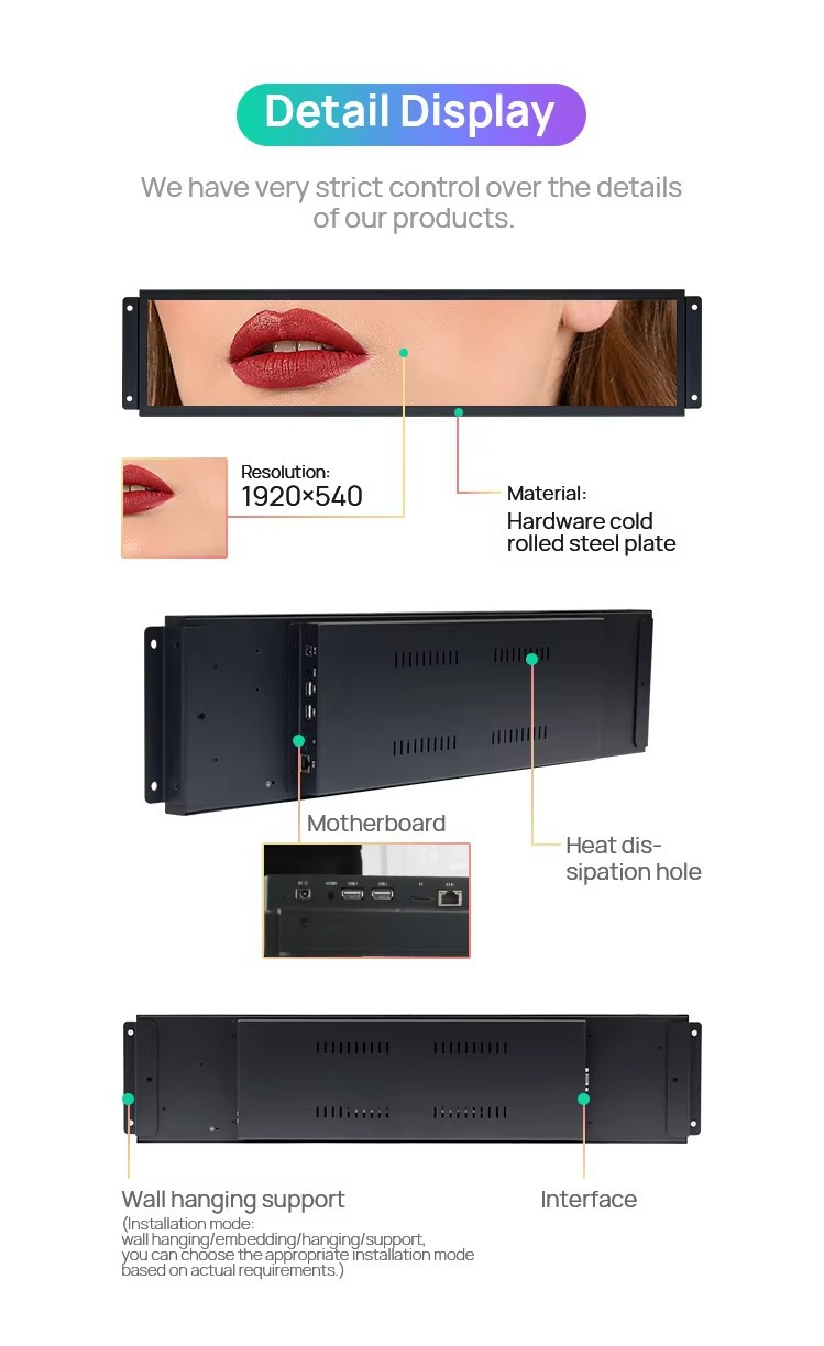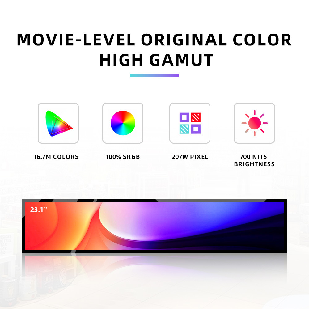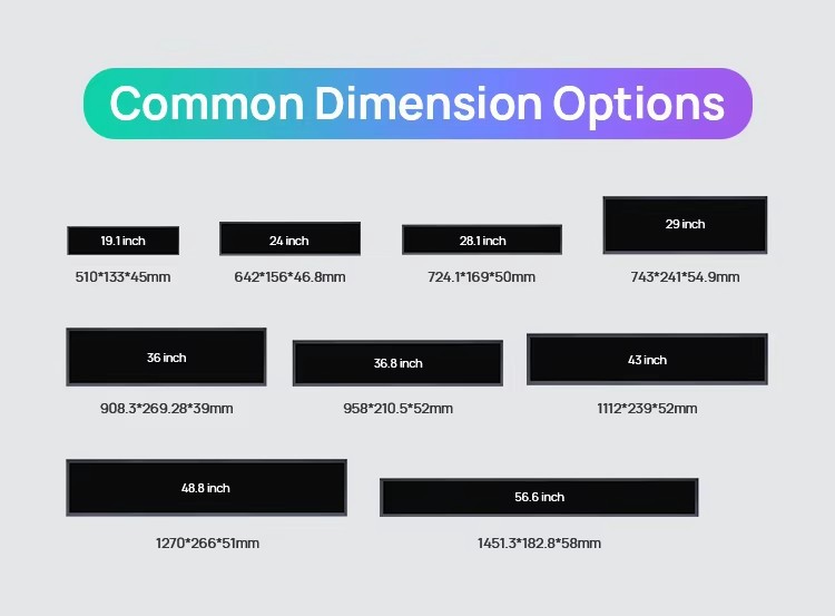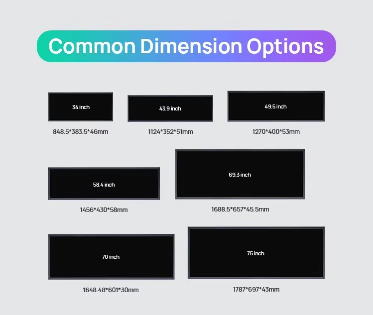 | Especificaciones | Tamaño completo y gran precio, pantalla de barra de 12.1 pulgadas, pantalla de barra de 17 pulgadas, pantalla de barra de 18.5 pulgadas, pantalla de barra de 19.1 pulgadas, pantalla de barra de 21.5 pulgadas, pantalla de barra de 23.8 pulgadas, pantalla de barra de 27 pulgadas, pantalla de barra de 29 pulgadas, pantalla de barra de 32 pulgadas, pantalla de barra de 34 pulgadas, pantalla de barra de 39 pulgadas, pantalla de barra de 40 pulgadas, pantalla de barra de 43 pulgadas, pantalla de barra de 46 pulgadas, pantalla de barra de 49 pulgadas, pantalla de barra de 55 pulgadas, pantalla de barra de 65 pulgadas |
