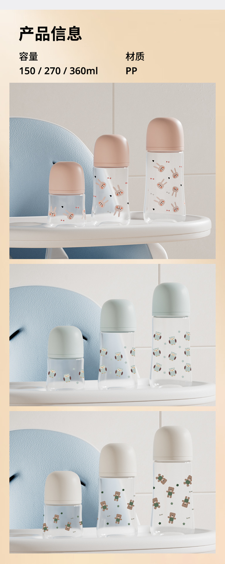 Biberón de PP de 240 ml para bebé con asa diseño anticaída boca estándar venta al por mayor de fábrica