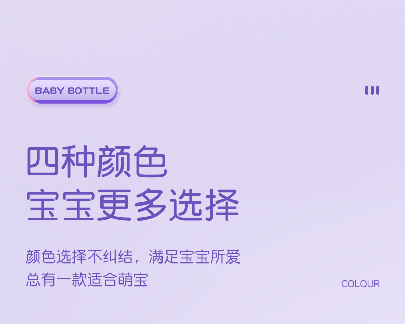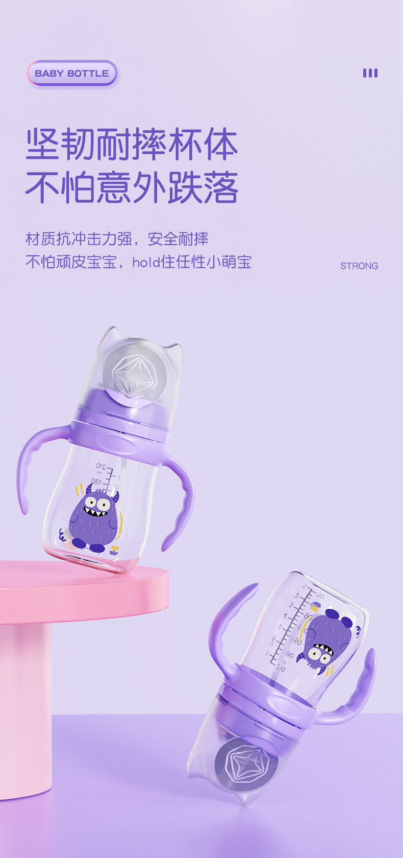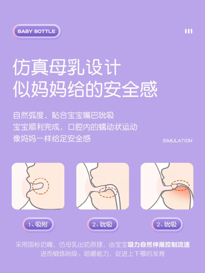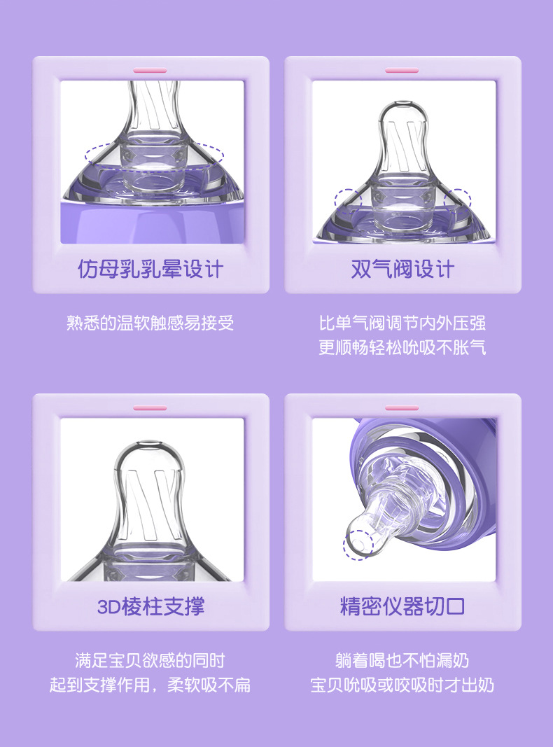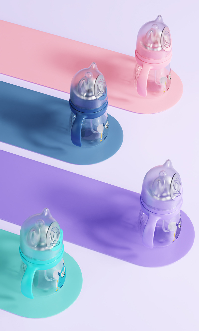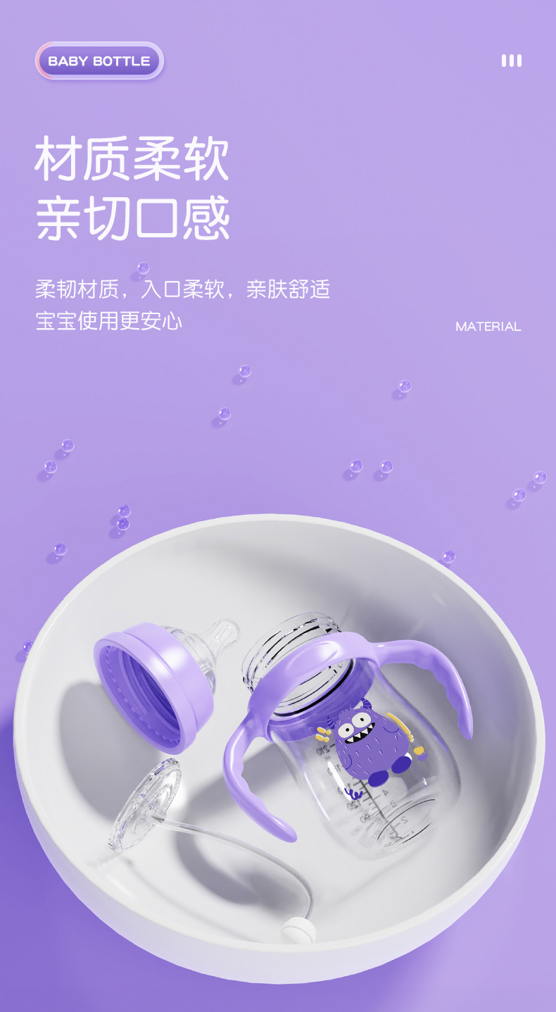 材质:瓶身/食品级PP,奶嘴/食品级硅胶,手柄/食品级PP