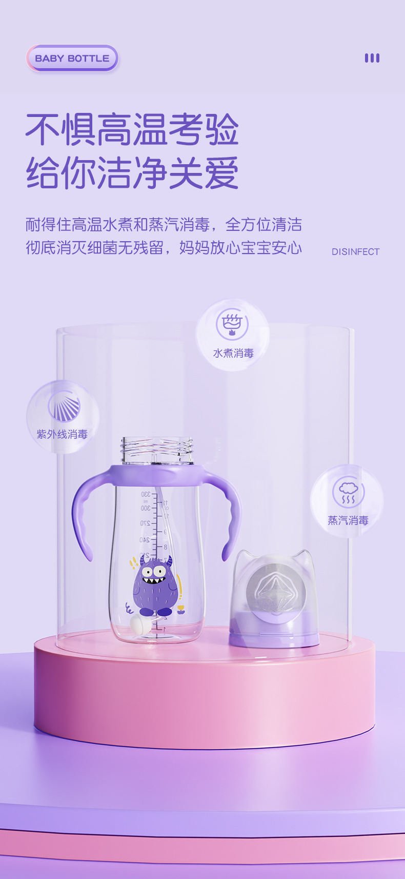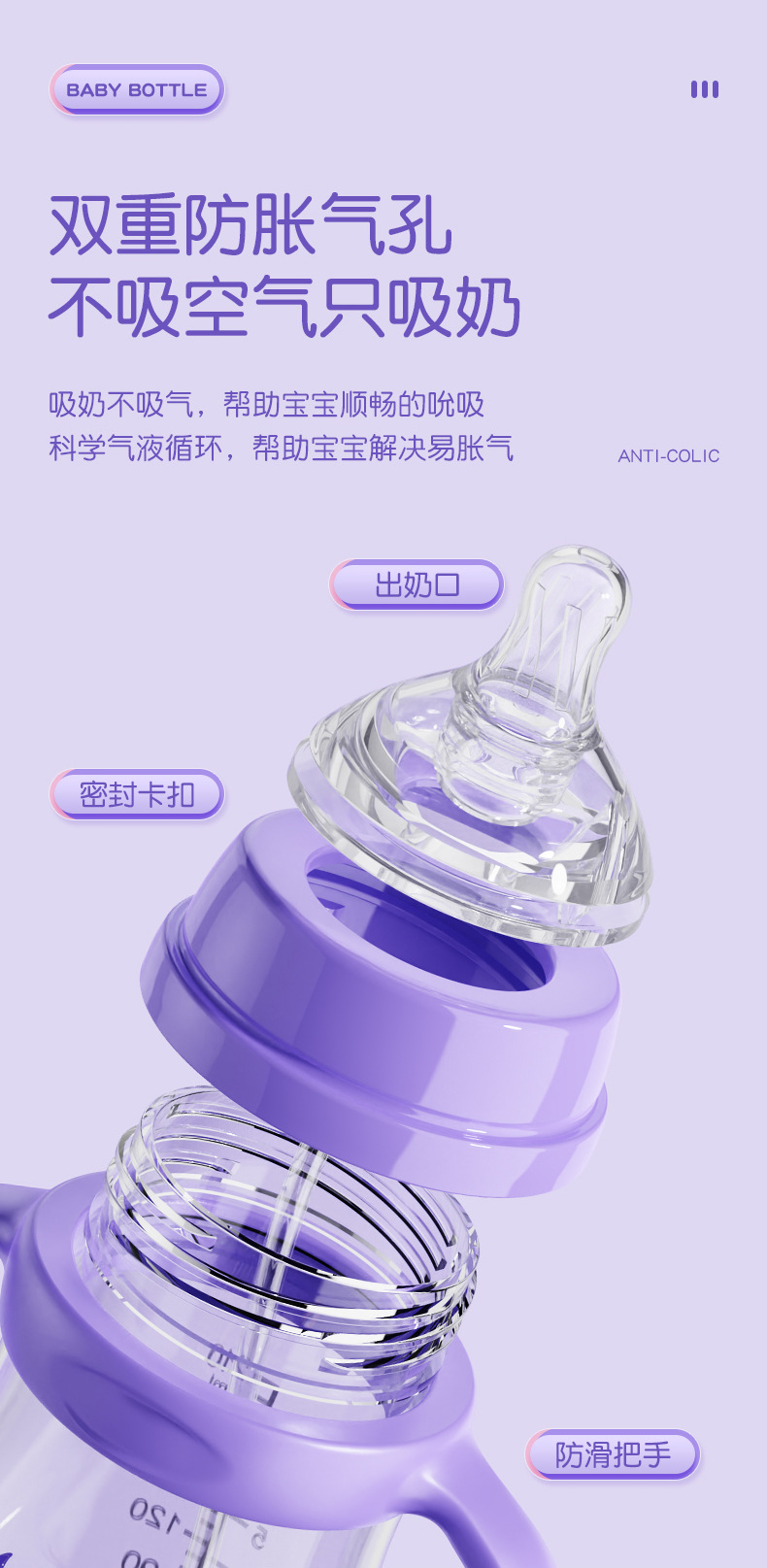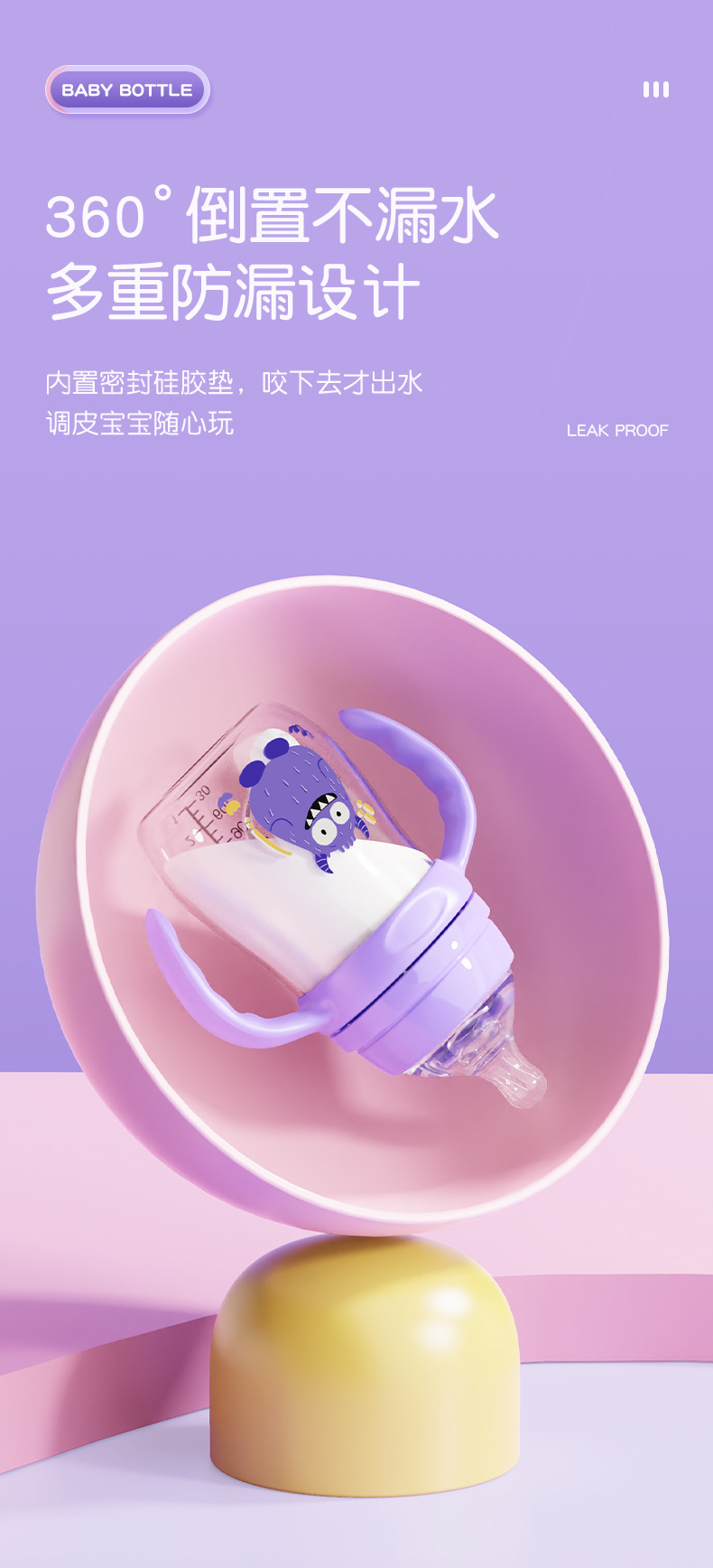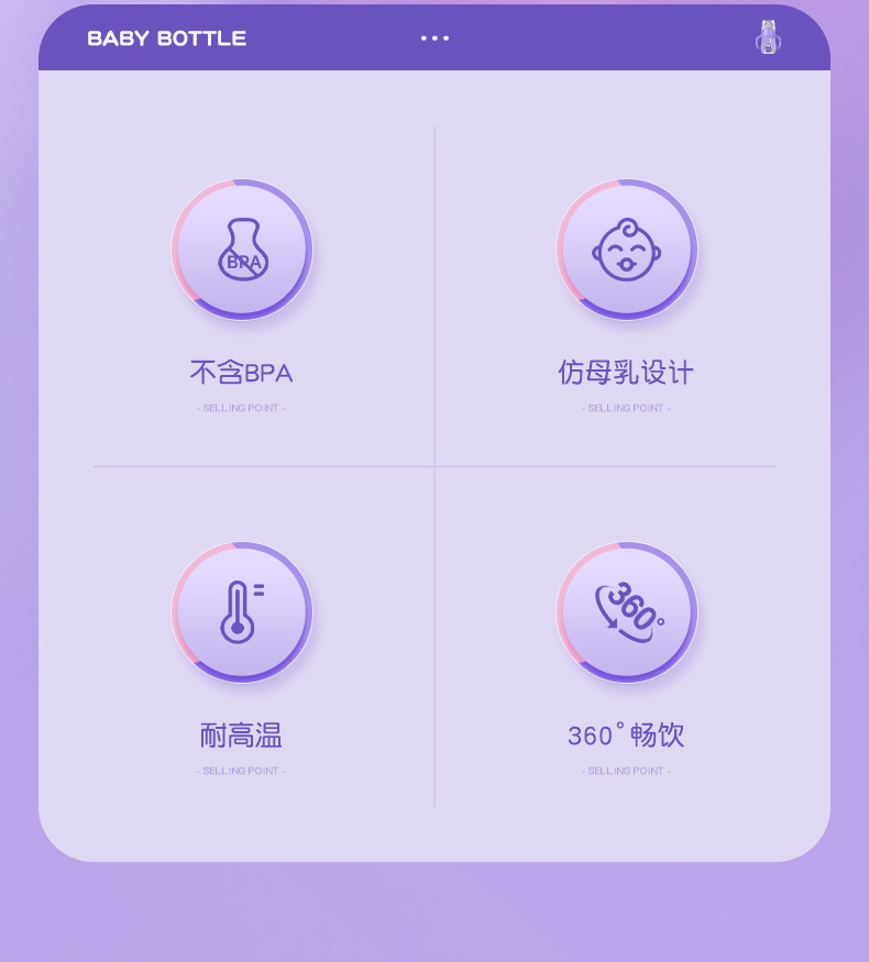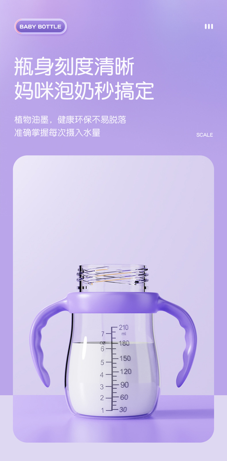 材质:瓶身/食品级PP,奶嘴/食品级硅胶,手柄/食品级PP