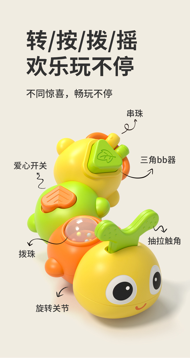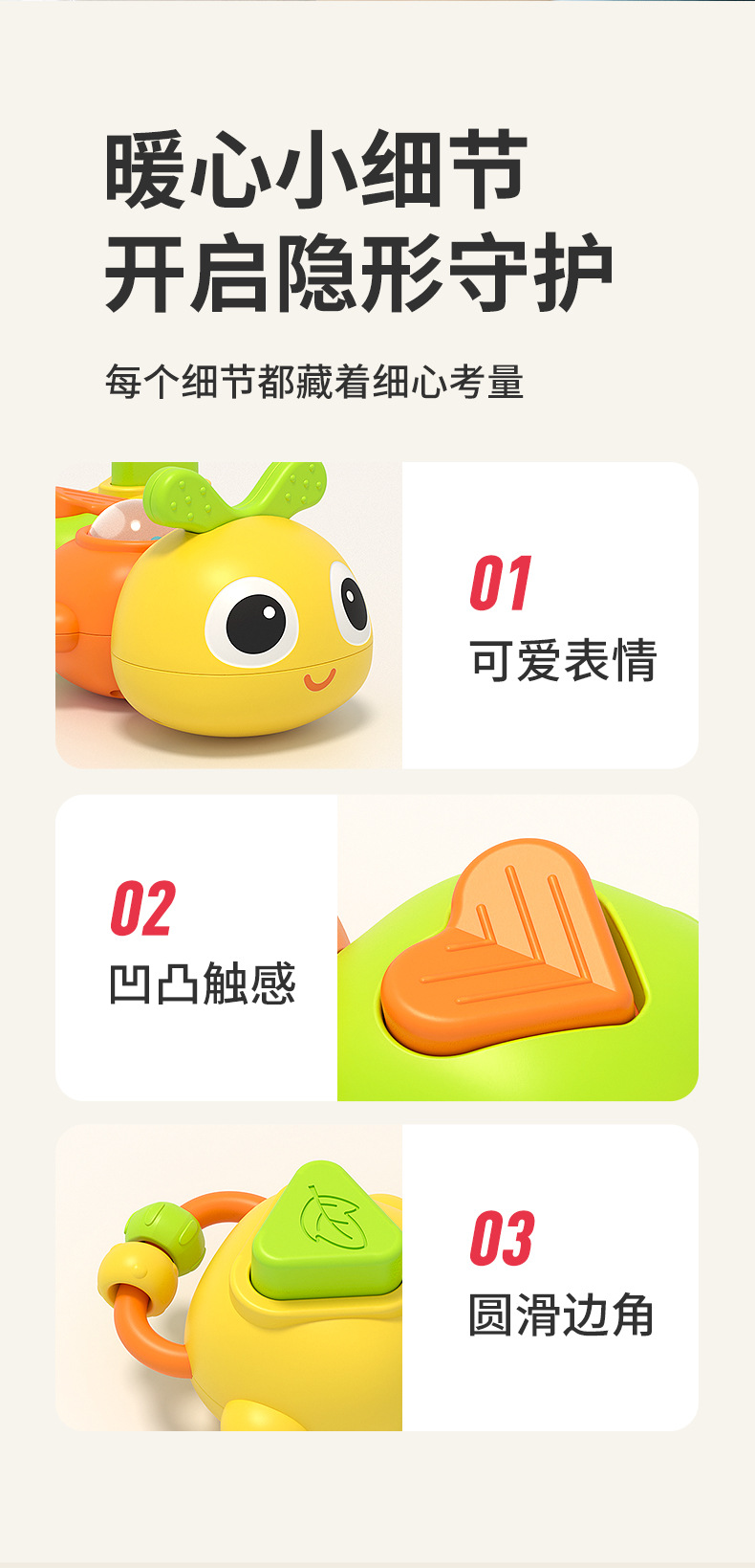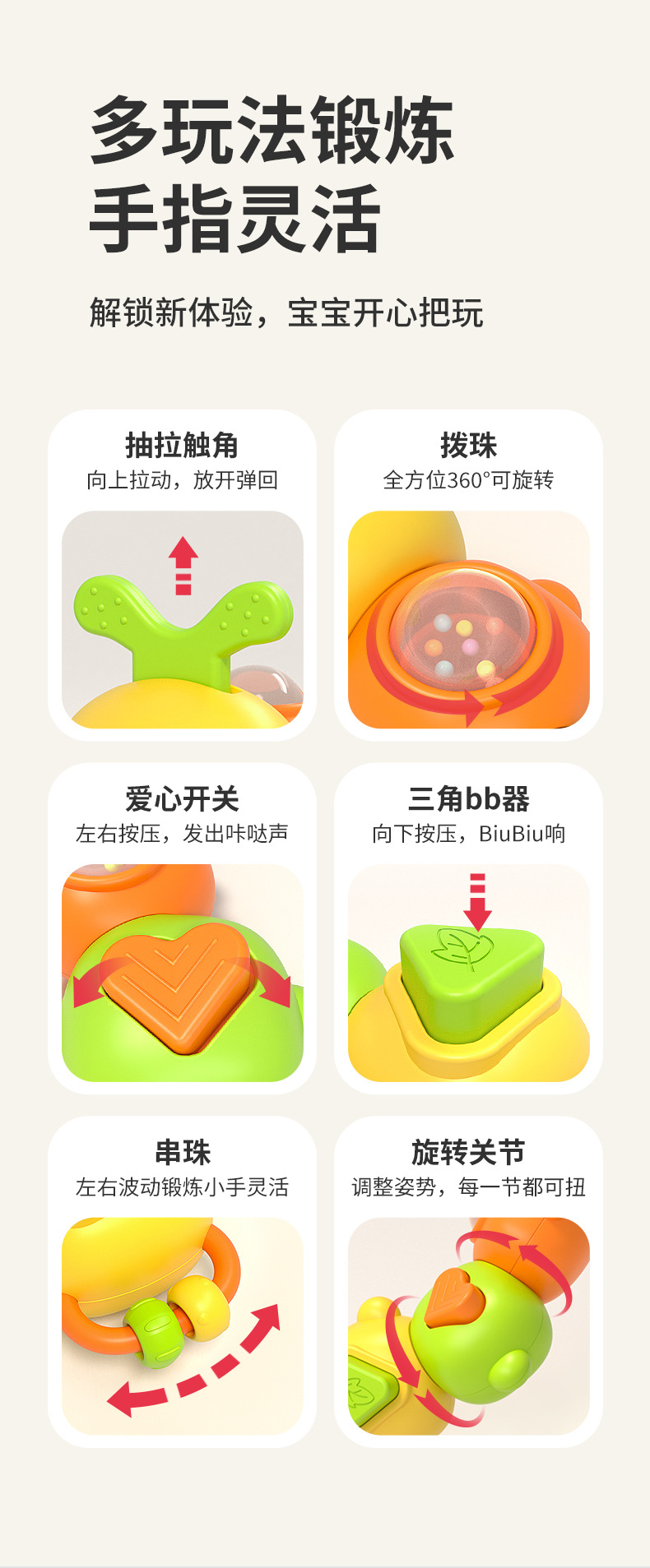| Desarrollo de la capacidad | Emoción, visión, desarrollo intelectual, reptiles, Movimiento de manos y cerebro, agarre, sentidos, coordinación mano - ojo, otros desarrollos de habilidades, juguetes interactivos, audición |