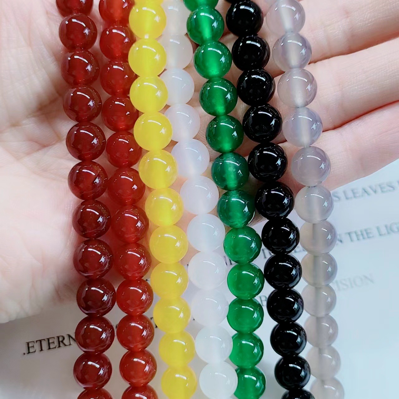 | Color | Ágata roja oscura de grado 7A, ágata roja media de grado 7A, ágata roja de grado 5A, ágata roja de grado 3A (mala calidad, ten cuidado con la foto), ágata negra de grado 7A, ágata negra de grado 5A, ágata negra de grado 3A (mala calidad, ten cuidado con la foto), ágata verde de grado 7A, ágata gris de grado 7A, ágata amarilla de grado 7A, ágata blanca de grado 7A, ágata azul de grado 7A. |
