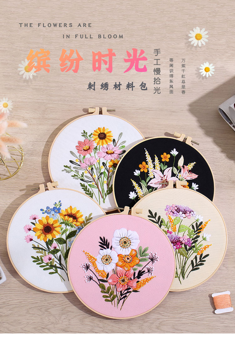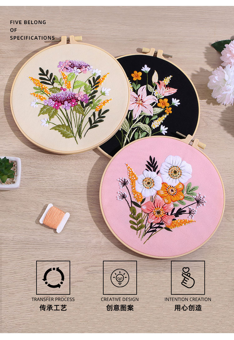每个图案的材料包由OPP袋子单独包装,然后和绣绷进行二次包装(用PE拉链袋),这样就组成了单套(材料包+绣绷)。