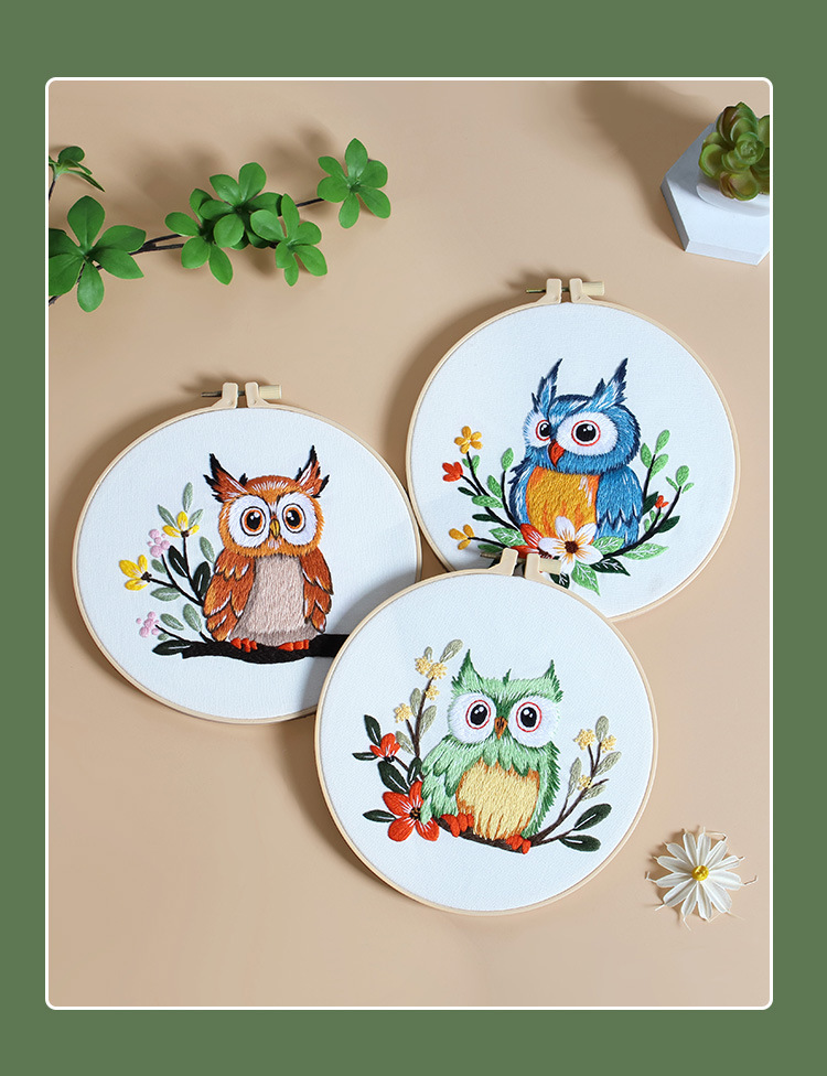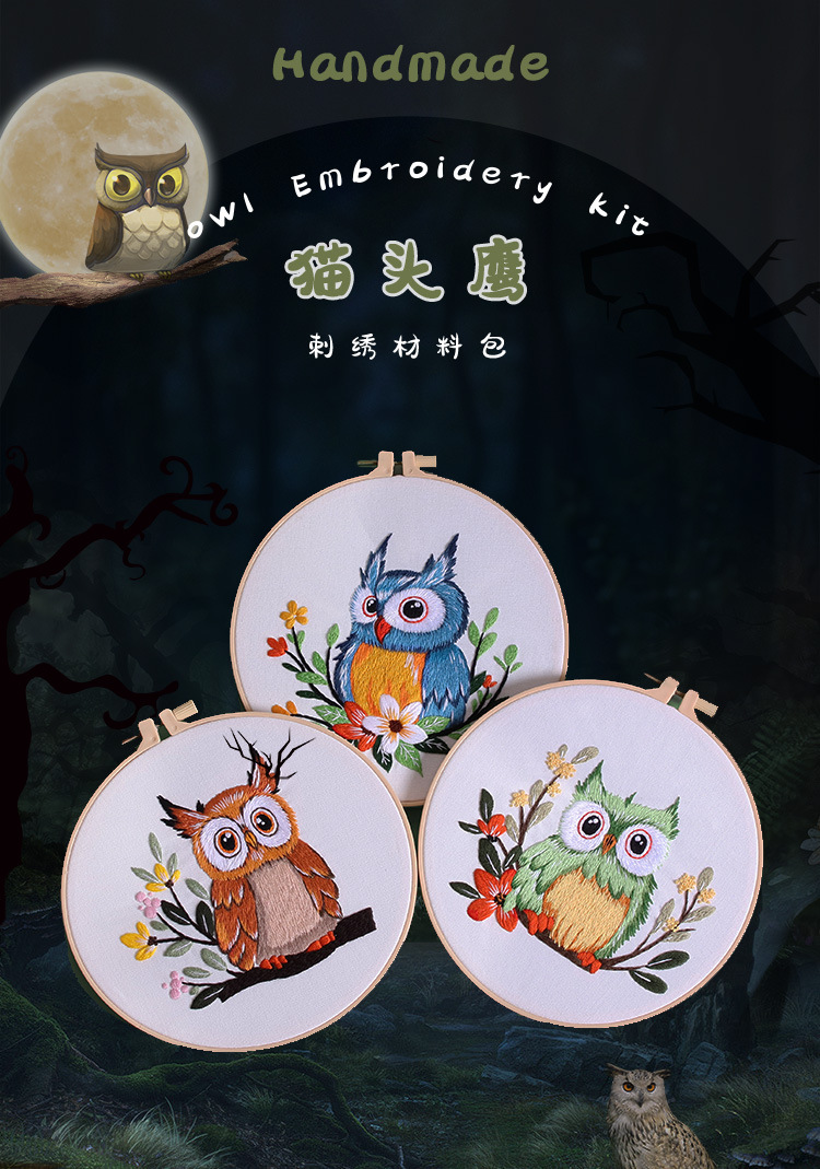 几个图案的OPP袋装材料包,再加上1个或者几个绣绷,然后另外配上剪刀穿线器等选配小工具,用PE拉链袋进行二次包装,这样就组成了一个组合,称为3件套、4件套等。