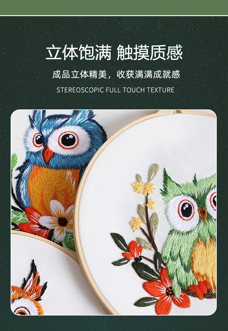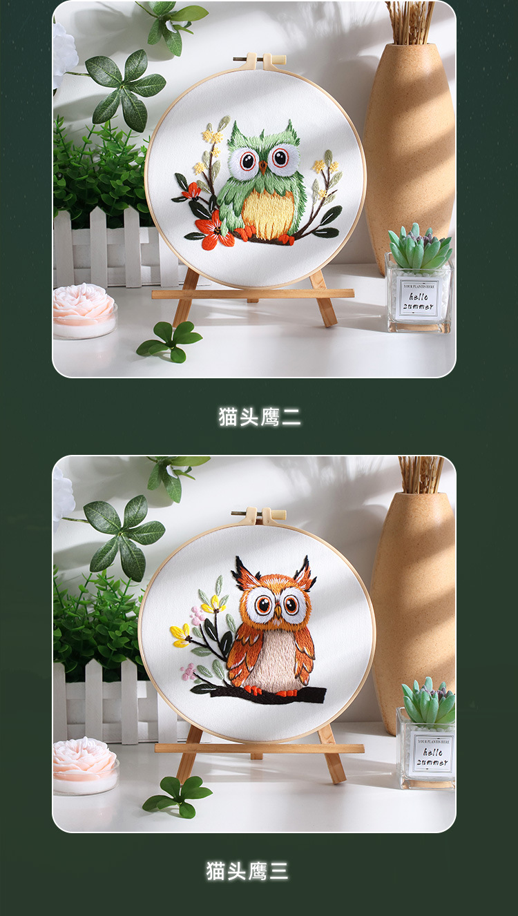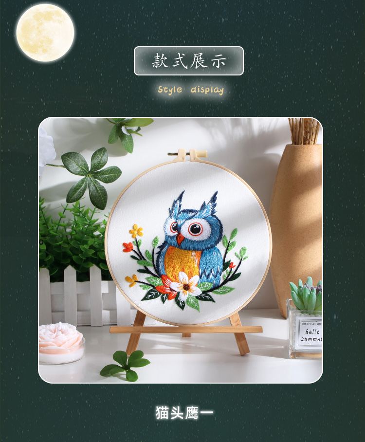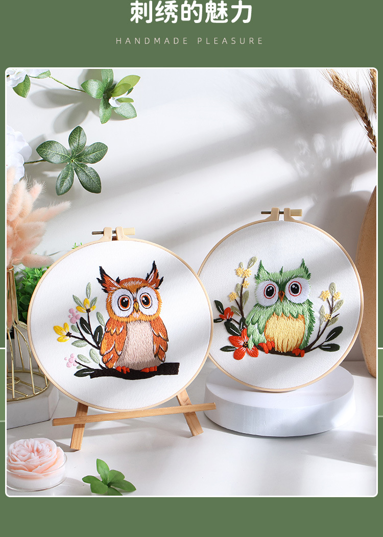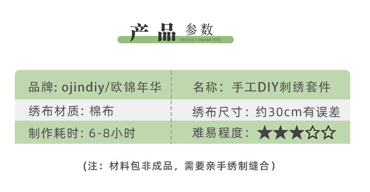 每个图案的材料包由OPP袋子单独包装,然后和绣绷进行二次包装(用PE拉链袋),这样就组成了单款的一套(材料包+仿竹绣绷),简称单套。