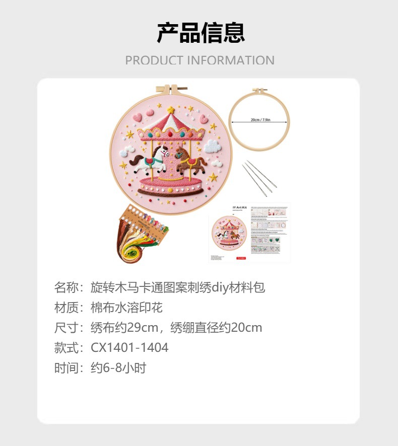 每个图案的材料包由OPP袋子单独包装,然后和绣绷进行二次包装(用PE拉链袋),这样就组成了单套(材料包+绣绷)。