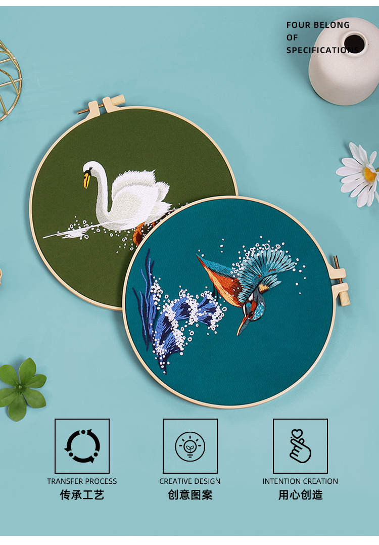 每个图案的材料包由OPP袋子单独包装,然后和绣绷进行二次包装(用PE拉链袋),这样就组成了单款的一套(材料包+仿竹绣绷),简称单套。