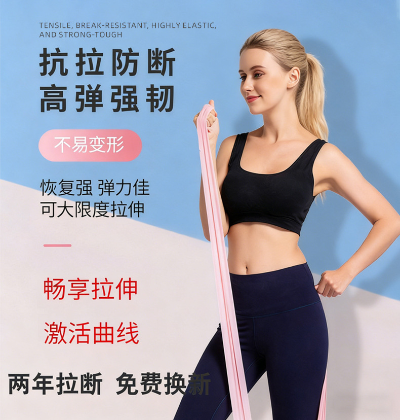 采用进口天然乳胶原料,万次拉伸测试,回弹力值稳定不衰减。柔韧不易断,环保无异味,给用户更安心的训练体验。