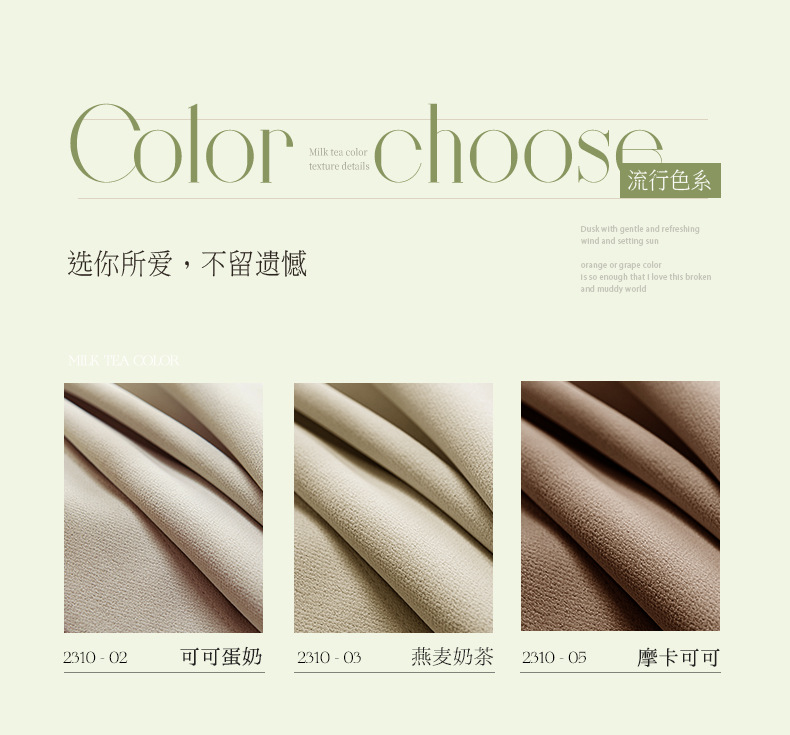 | Color | Rosas de sol, té con leche de avena, fresas cardíacas, azul bruma, cacao mocha, leche de huevo de cacao, ceniza fantasma, ceniza de humo, azul Alice |
