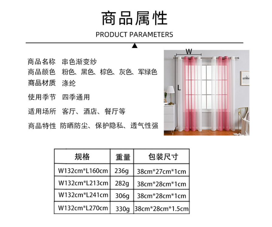 | Especificaciones | Pantalla de ventana degradada de color de cadena w: 132cm * l: 160cm perforada 1pcs, pantalla de ventana degradada de color de cadena w: 132cm * l: 213cm perforada 1pcs, pantalla de ventana degradada de color de cadena w: 132cm * l: 241cm perforada 1pcs, pantalla de ventana degradada de color de cadena w: 132cm * l: 270cm perforada 1pcs |