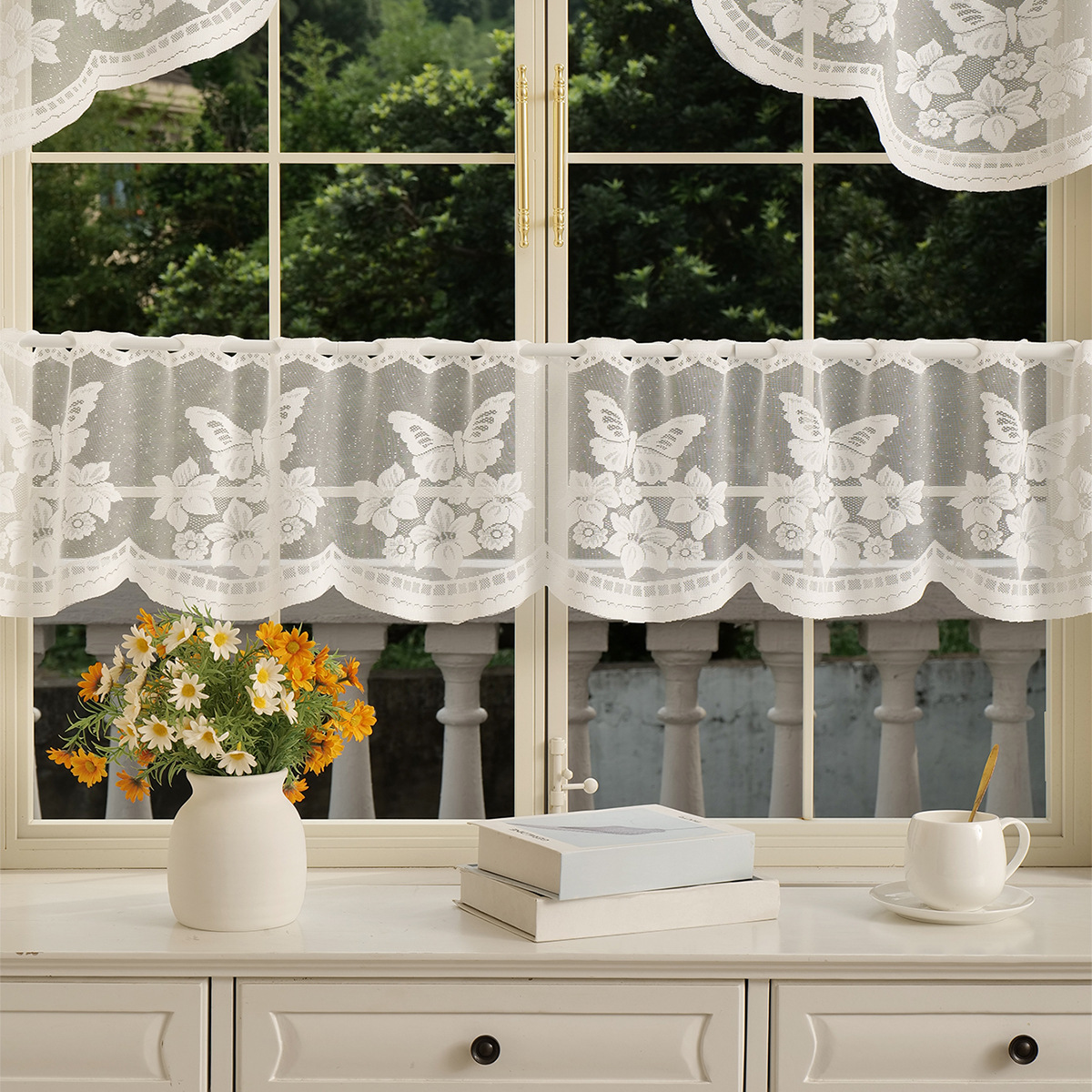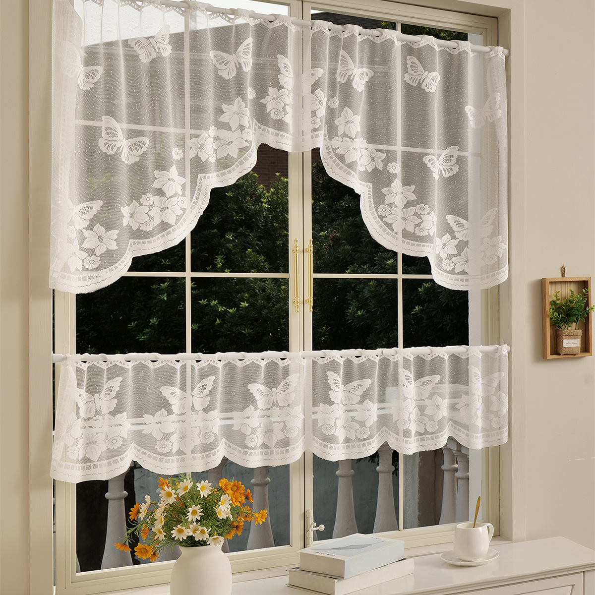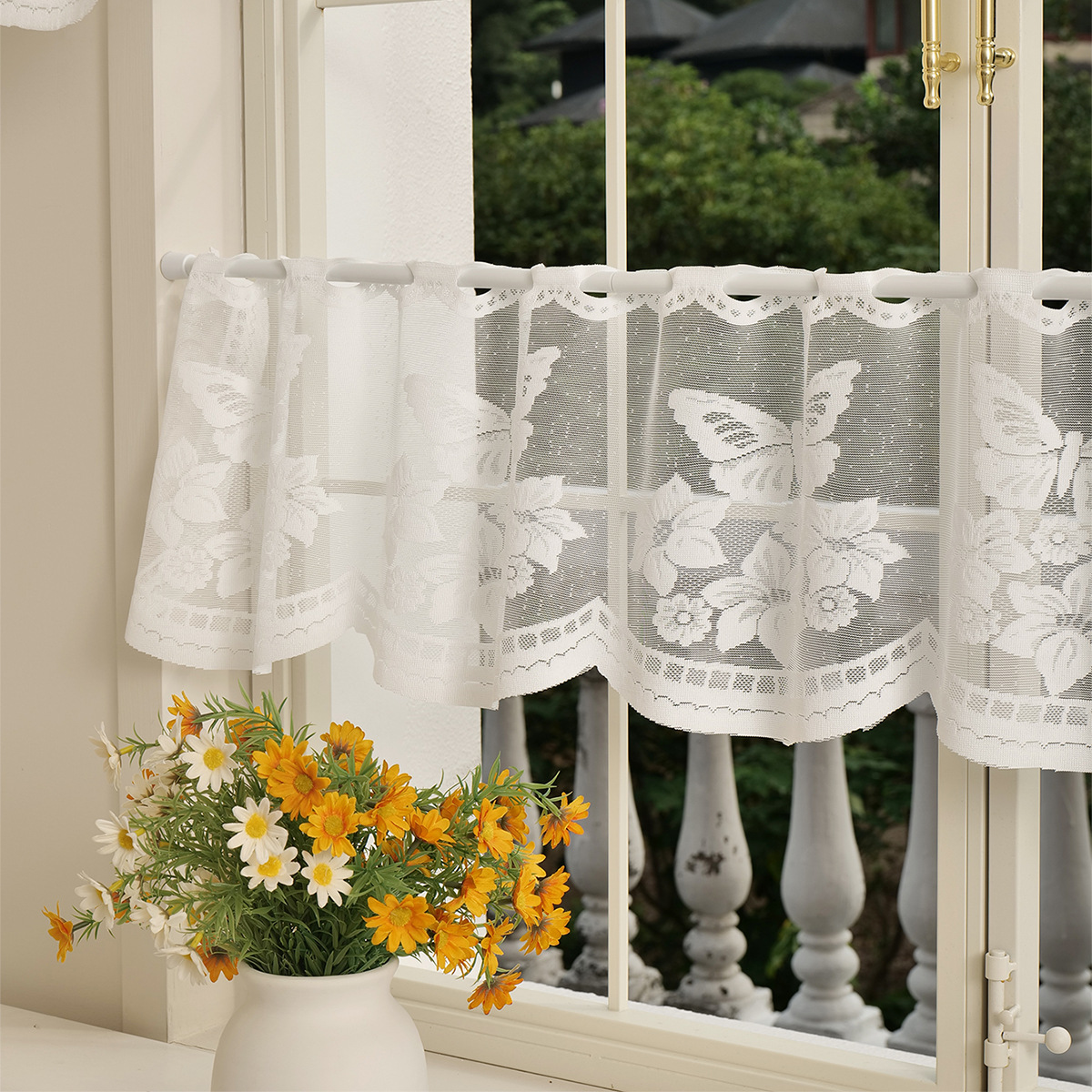 | Color | Media cortina de flores de sombra de mariposa, media cortina de flores de enredadera, media cortina de Flores rotas en blanco, media cortina de flores soleadas |