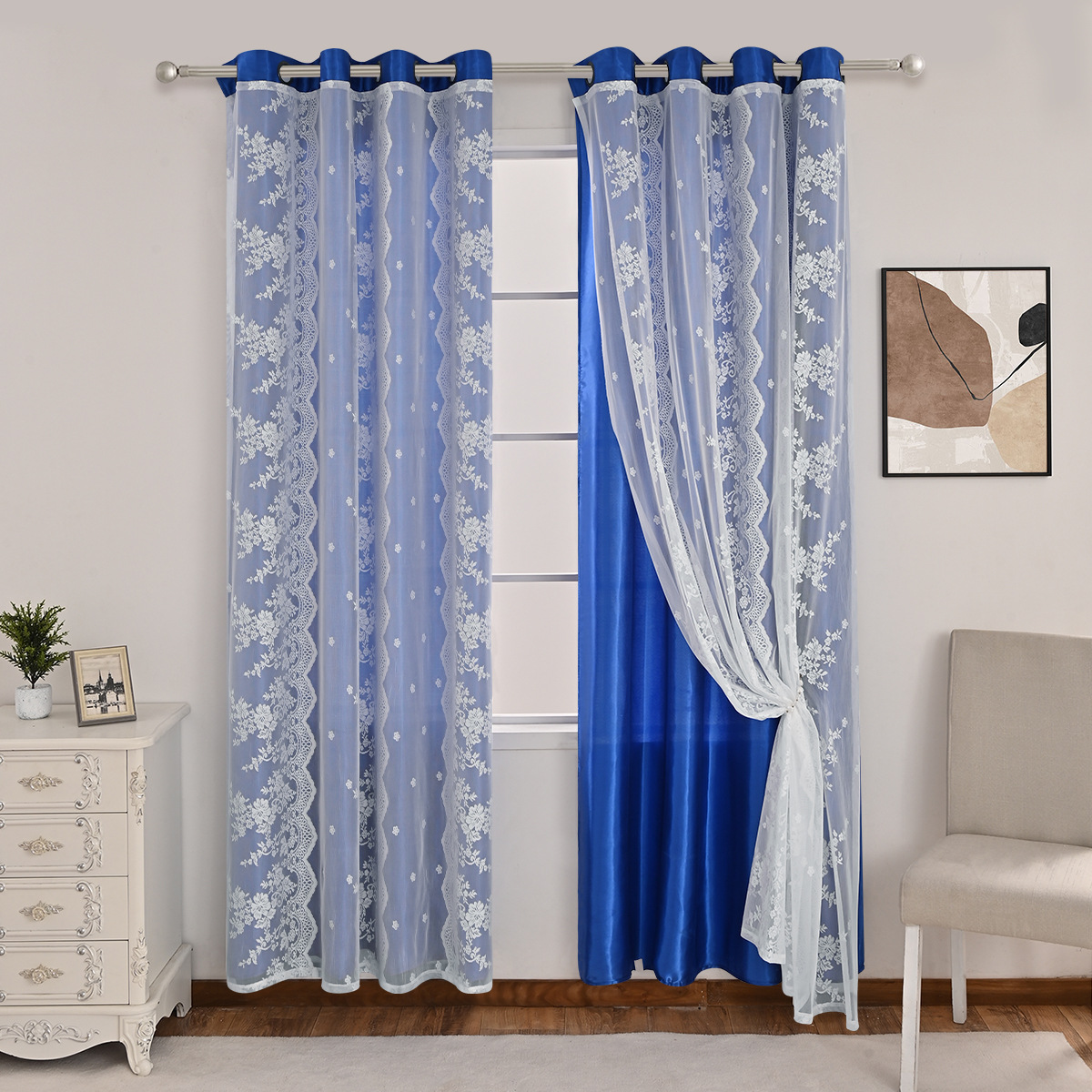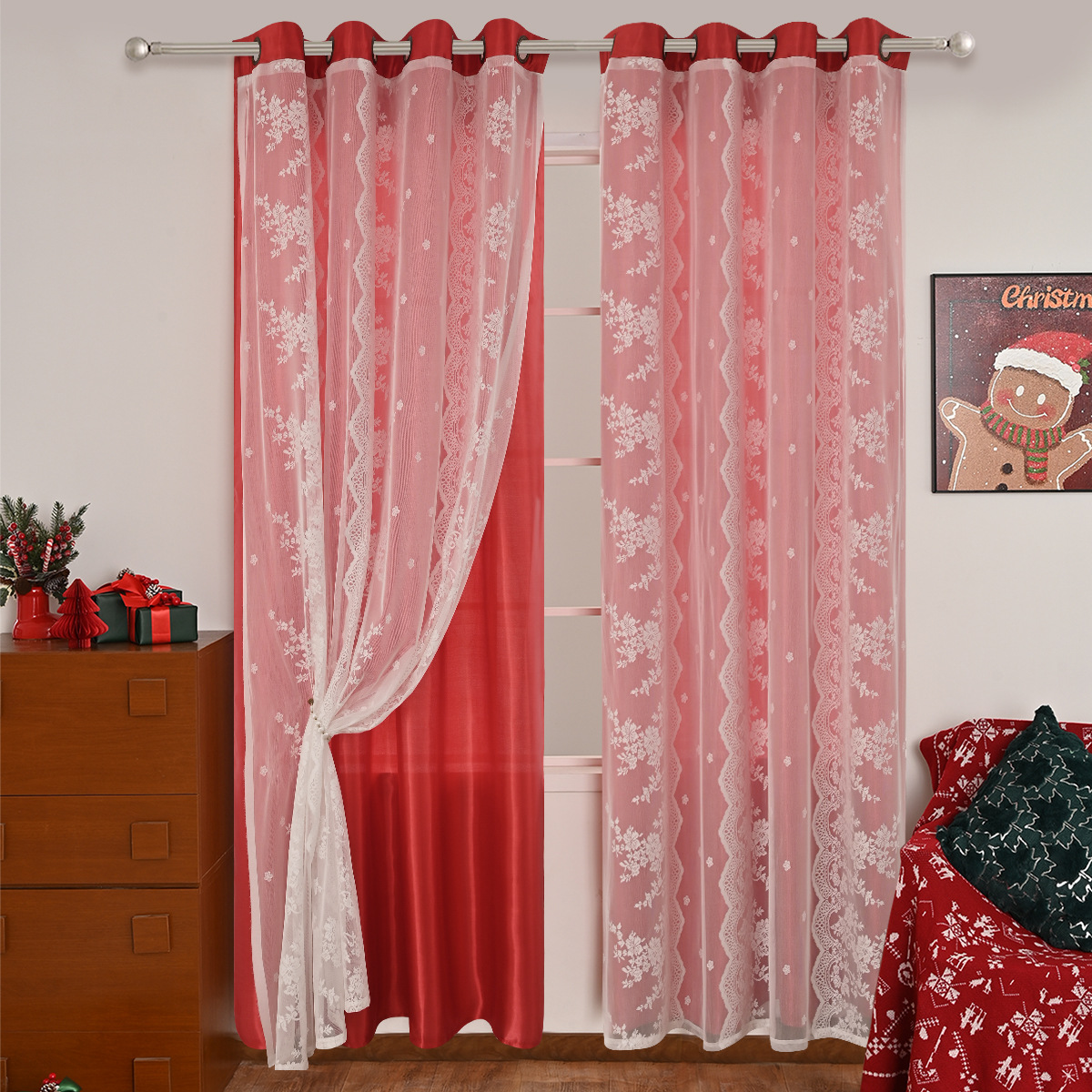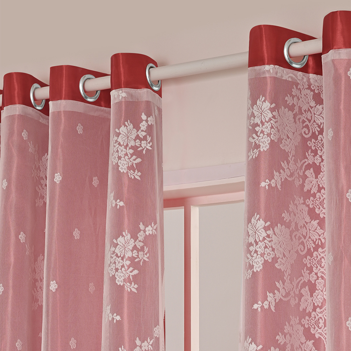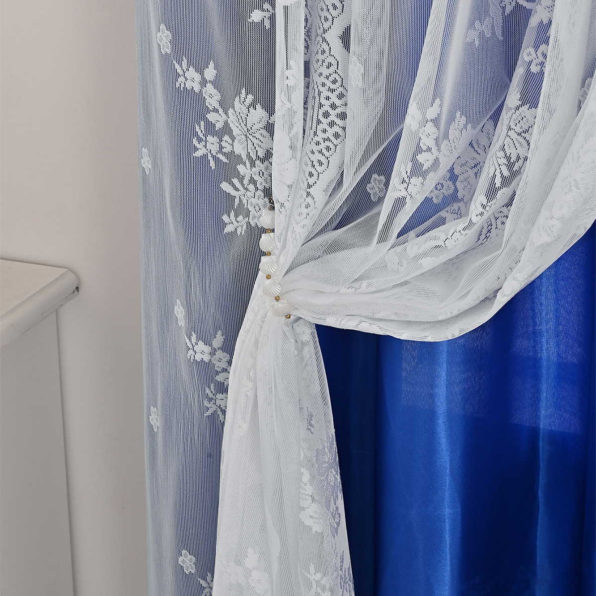 Cinco hermosos satén, tres filas de cortinas de doble capa de flores perforadas