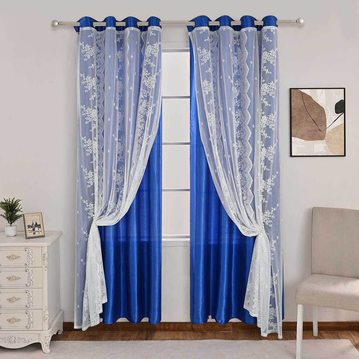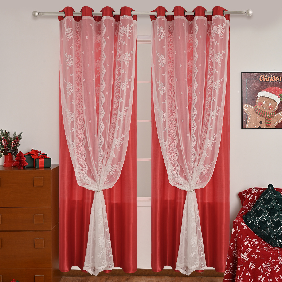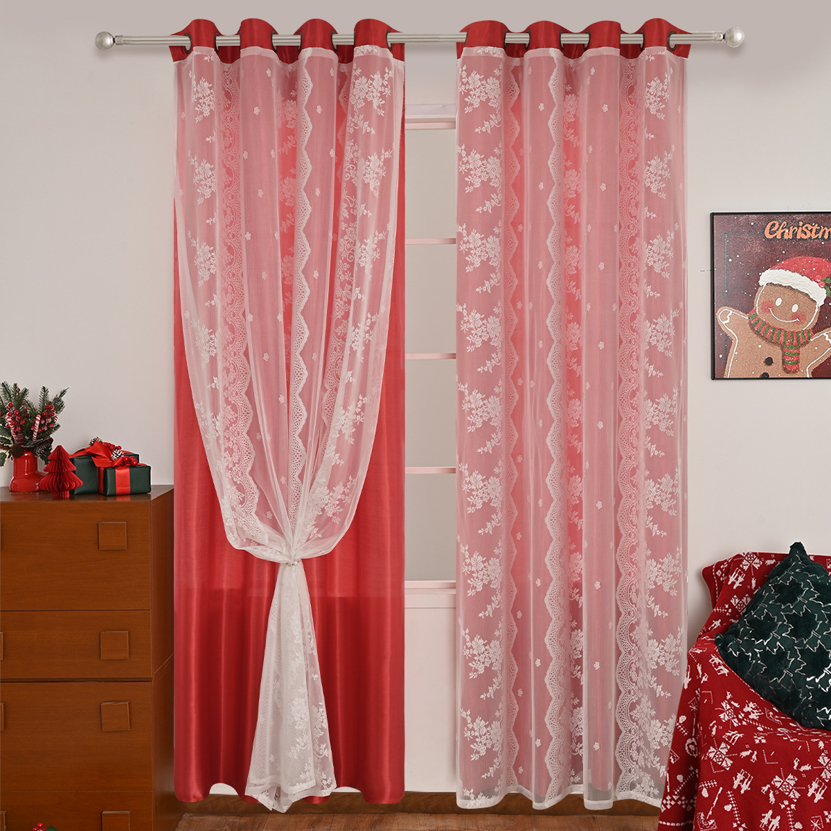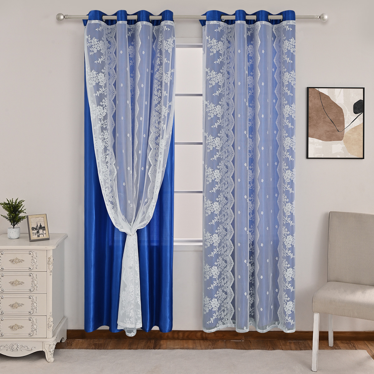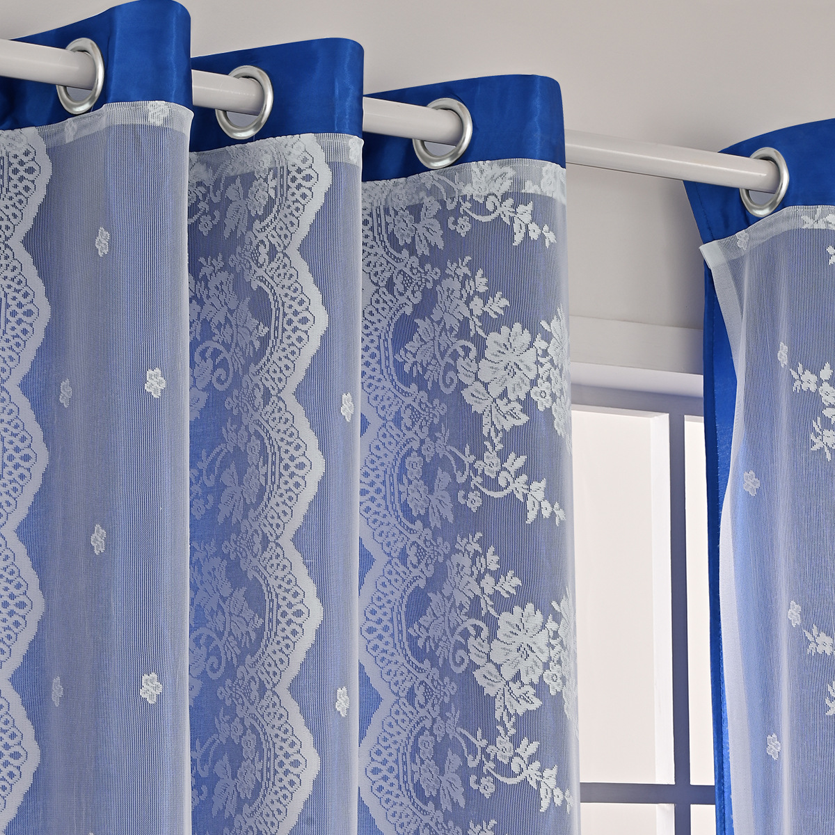 Cinco hermosos satén, tres filas de cortinas de doble capa de flores perforadas