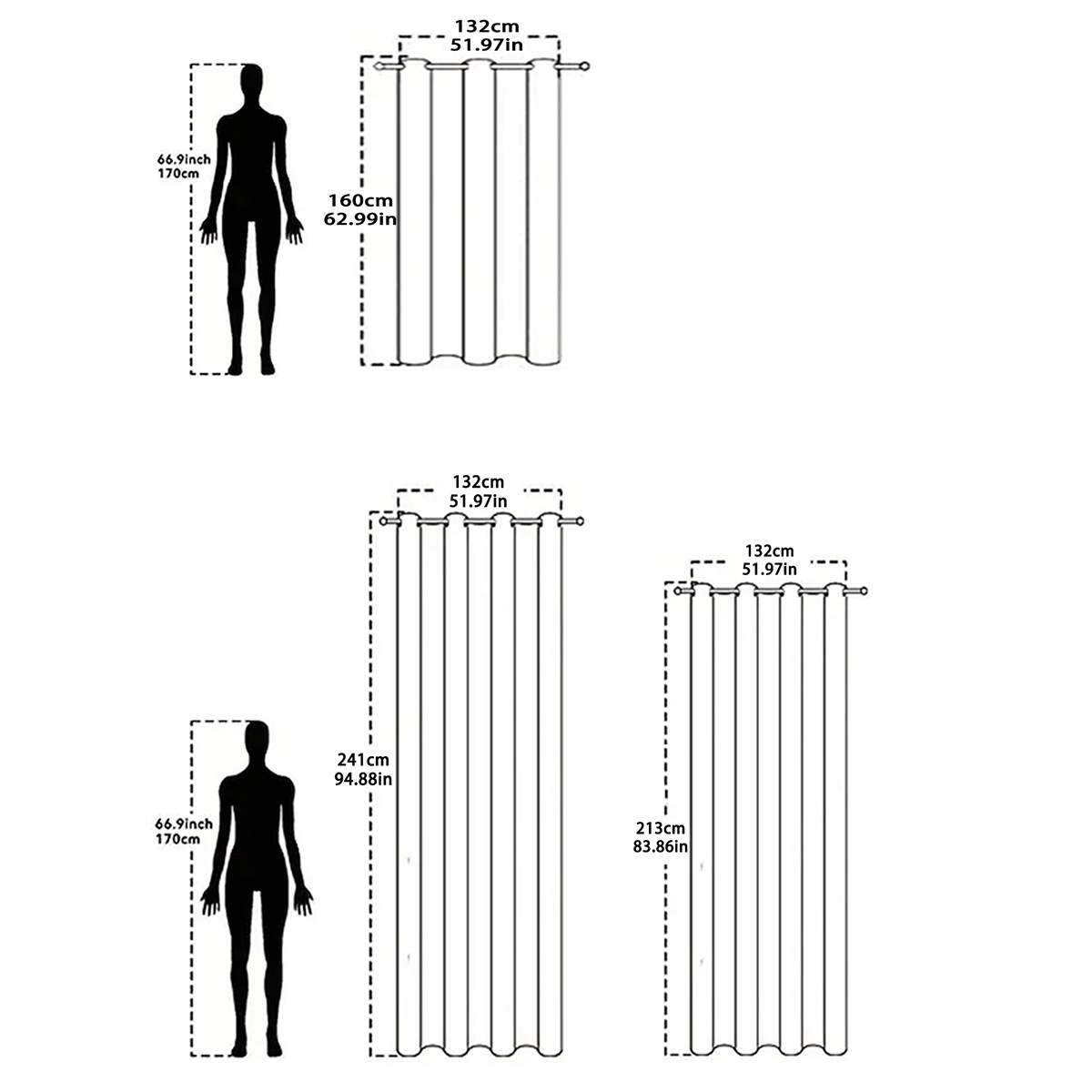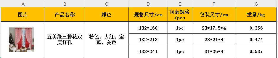 132 * 160cm (una pieza perforada), 132 * 213cm (una pieza perforada), 132 * 241cm (una pieza perforada)